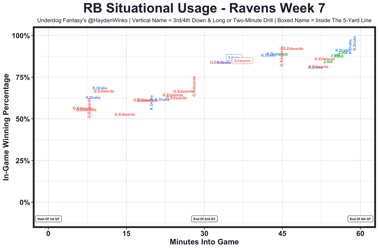 Gus Edwards - We broke him down with his tape here (video). Of note, Edwards was limited all week in practice, so his floor remains very low.