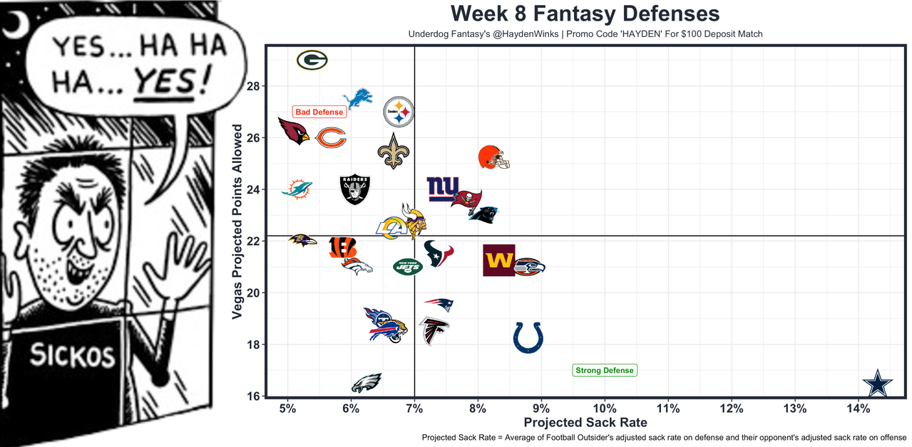 The defenses of the week are the Cowboys, Colts, Eagles, Patriots, 49ers, Seahawks, Bills, and Falcons (?). Never doubt the sickos chart.