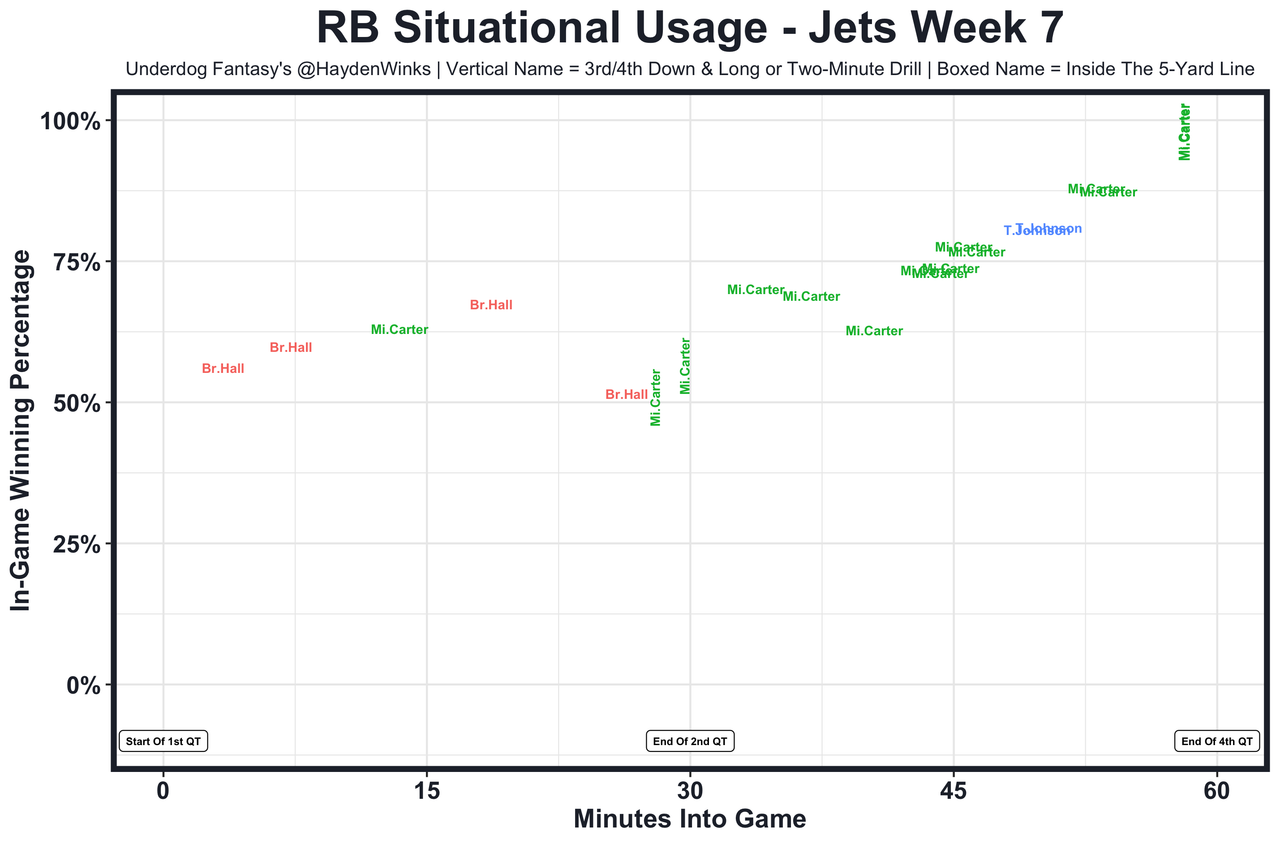 Michael Carter - The Jets are 5th in RB fantasy usage as a team this year, and with Zach Wilson at QB, they've been more reliant on the ground game in neutral situations. James Robinson didn't look healthy last week (a trend that's picked up since Week 4) and he won't have a full grasp of the playbook in Week 8. Carter should be the guy, as Breece Hall was over the last month when he was the RB5 in expected half PPR points. With that said, the Jets aren't projected for a ton of points with OL injuries and QB play holding back the offense. Carter, to me, hasn't been as good this year either, particularly hasn't shook arm tackles at the same rate as last year. Ultimately, I view Carter as a solid RB2 this week with him holding a 55/35/10 split over Robinson and Ty Johnson for the rest of the year.