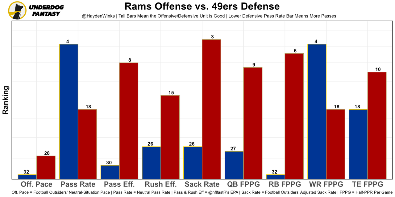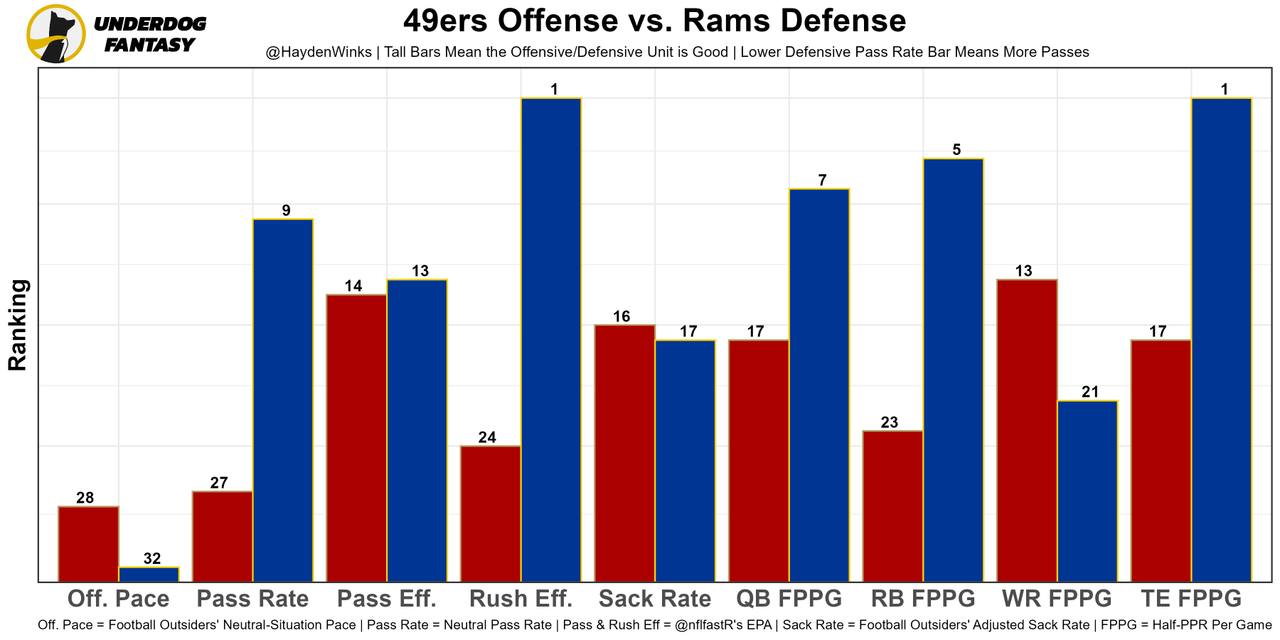 A game that features the No. 32 and No. 28 neutral pace offenses. After missing a bunch of players, the Niners' No. 3 adjusted sack rate defense is getting healthier at the worst time for Stafford.