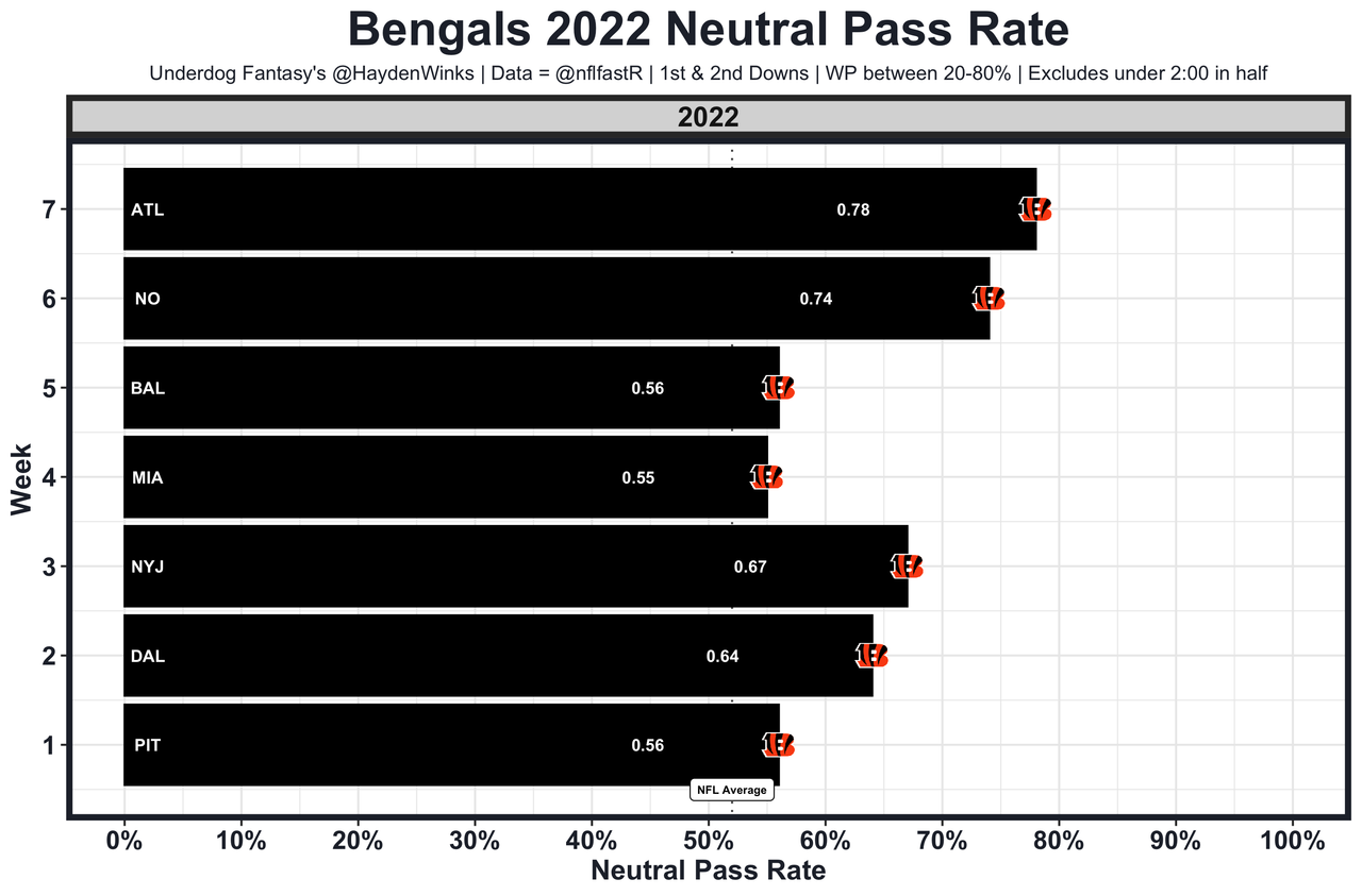 Tee Higgins - Ja'Marr Chase (hip) is out 4-6 weeks. With Chase healthy so far, Higgins is the WR12 per healthy game in half PPR. If the Bengals' league-high pass rate from the last two weeks hold, then Higgins and Tyler Boyd are going to be balling. I think they remain pass and shotgun heavy after having so much success recently. It plays to Joe Burrow's strengths.