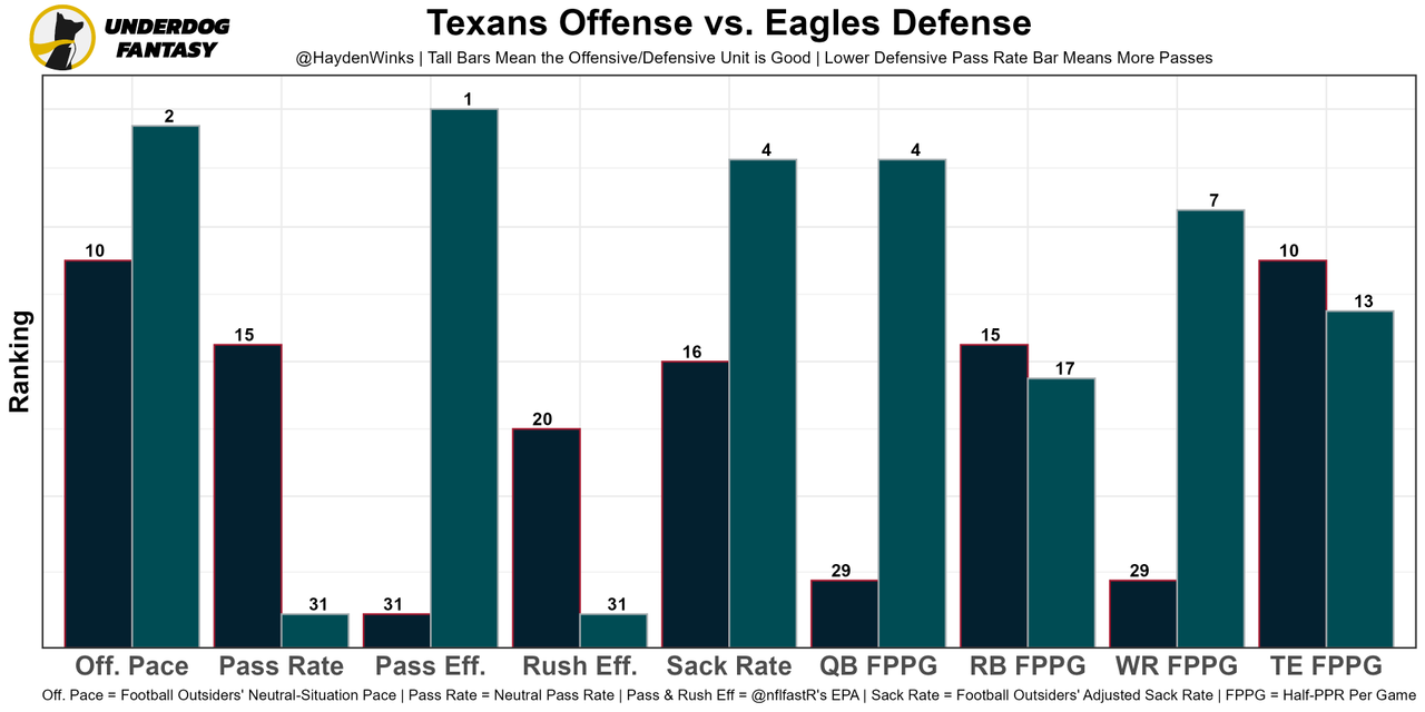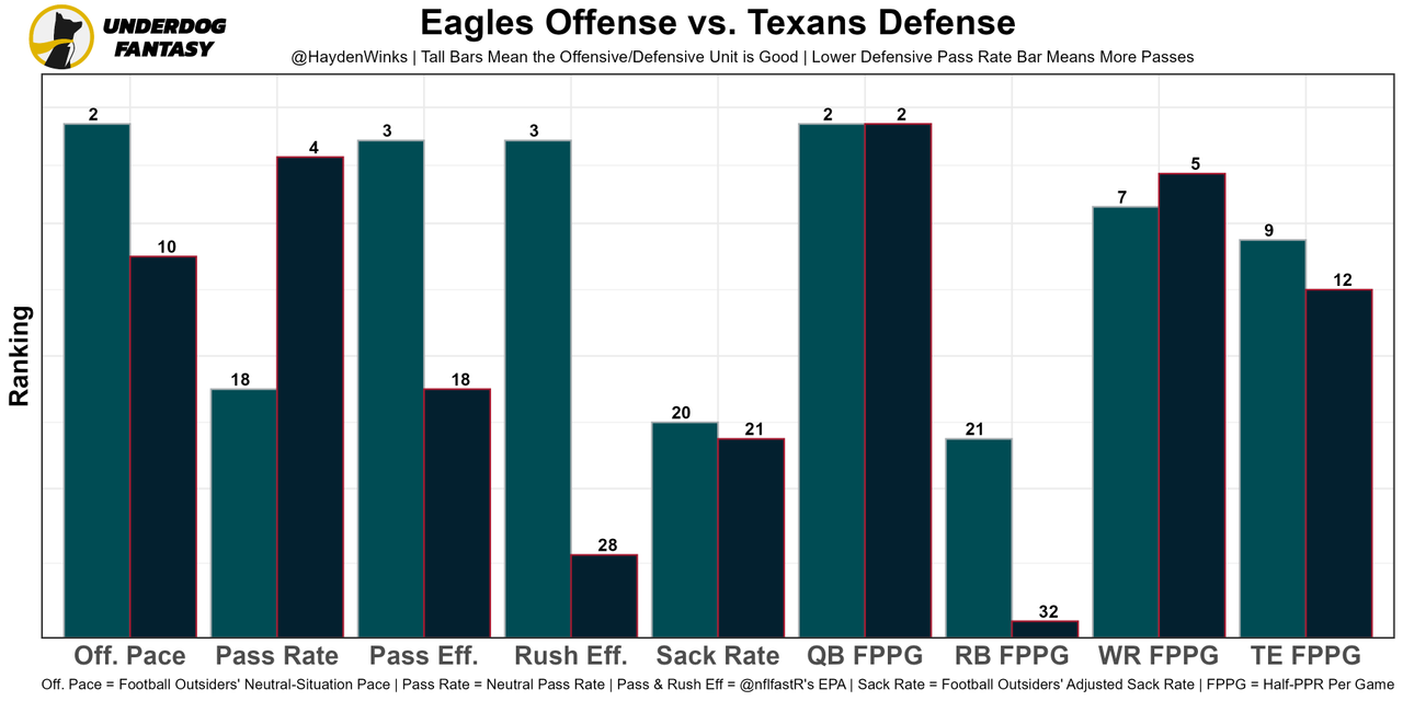 Miles Sanders - It's hard to balance the Eagles' "eruption spot" matchup (HOU is 32nd versus fantasy RBs) with Sanders' on/off splits with Boston Scott. Sanders has averaged 9.7 expected half PPR points in games with Scott and had 22.8 & 15.1 expected half PPR points without him. Scott is used to close out games.