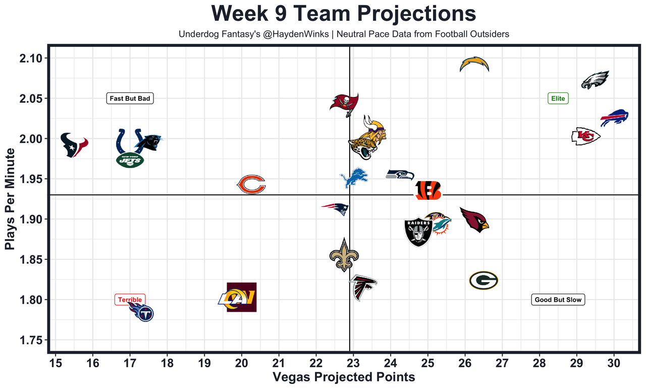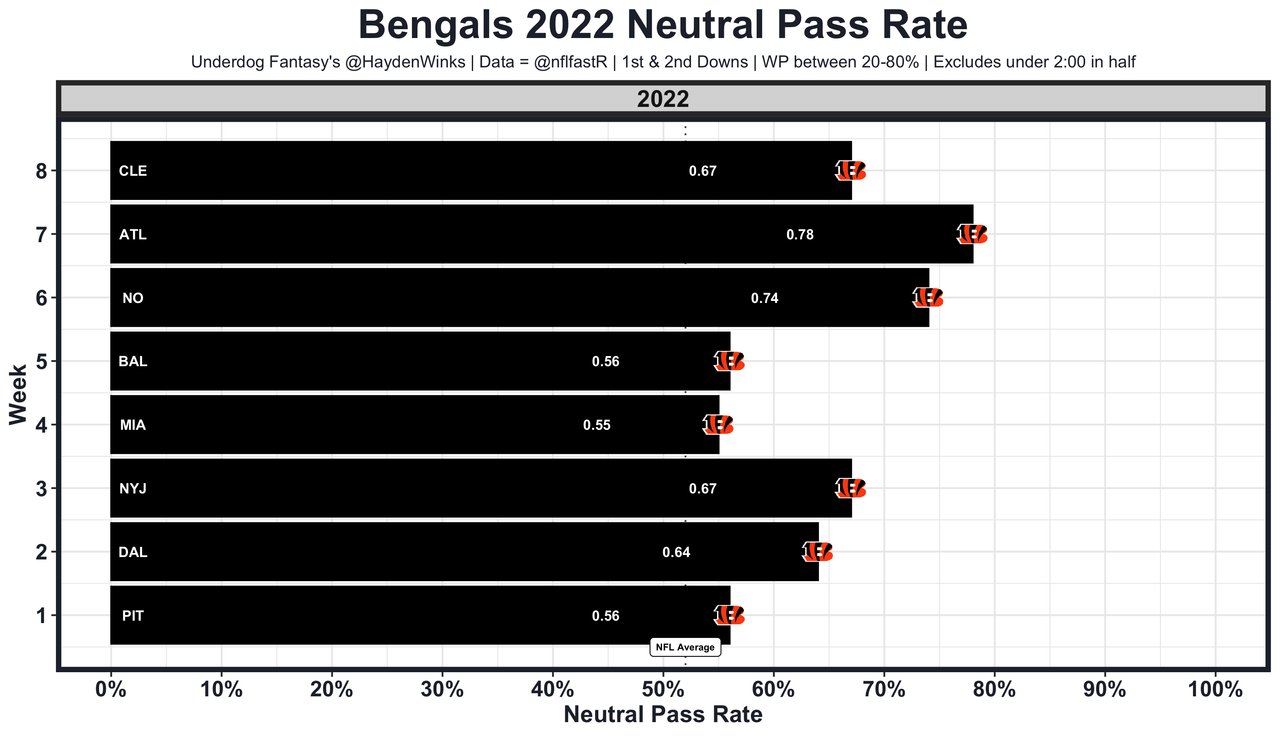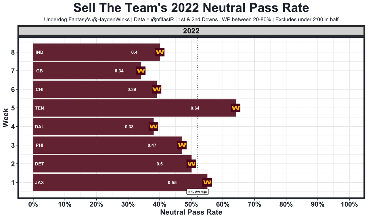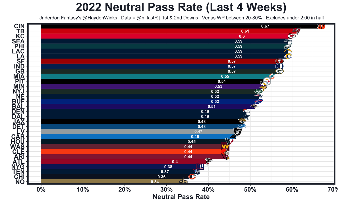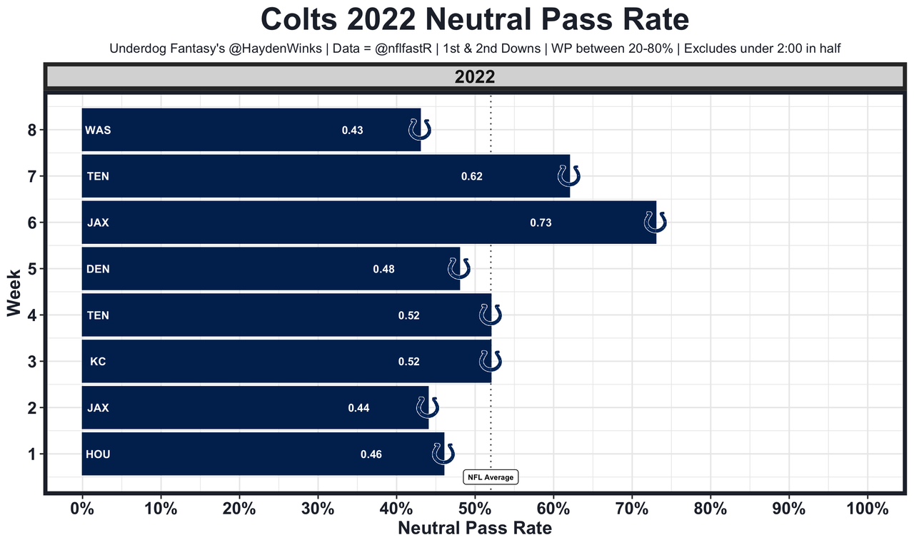 Michael Pittman - Season-low 43% neutral pass rate with Ehlinger, who played alright in general. Pittman is unlikely to see top-20 fantasy usage for the rest of the way. He simply just has to be really good. This week, it's the Patriots who could sell out to stop Pittman, clearly Indy's best skill player.