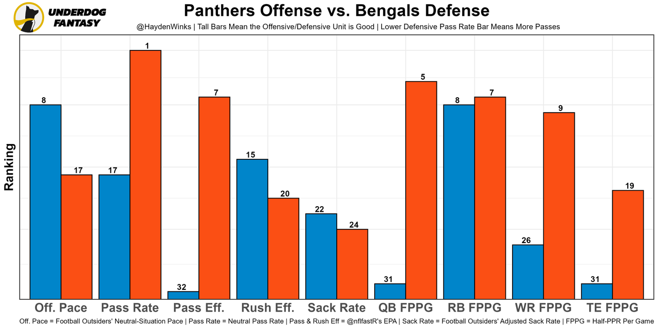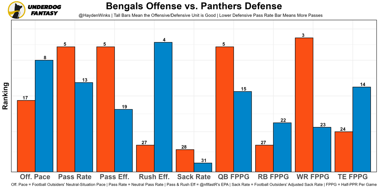 Terrible left and right tackle play, combined with some random touchdowns doomed the Bengals on Monday Night Football without Ja'Marr Chase. Burrow did miss some throws, too, but I think they get right at home against an up-and-down Panthers defense. At least the betting markets agree. Cincy has a 25-point team total.
