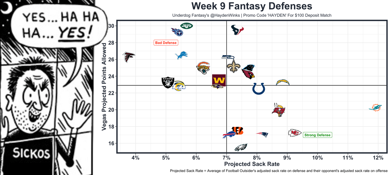 The defenses of the week are the Dolphins, Chiefs, Patriots, Eagles, Bills, Bengals, Bucs, and Vikings.
