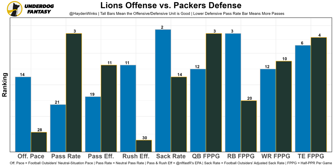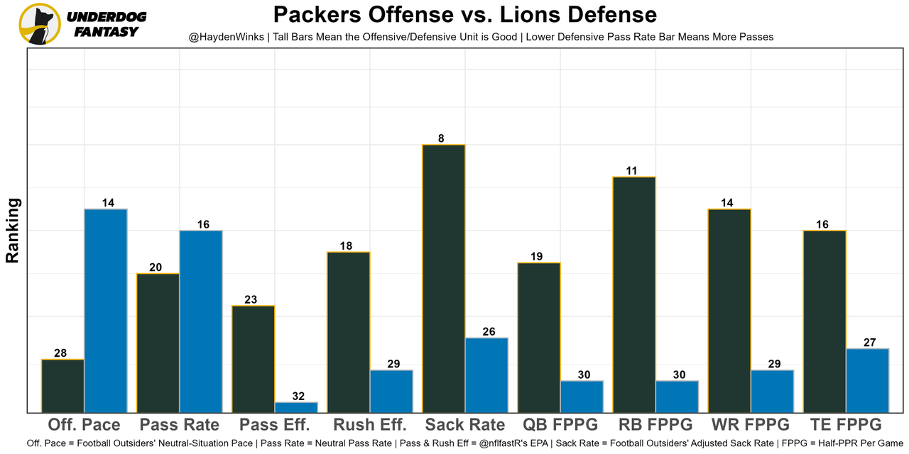Jamaal Williams - RapSheet says Swift "will likely be used sparingly. They'll be careful with his playing time." That likely means Williams will get the goal line role and some more between the 20s work. It's great timing for him, as the Packers run defense is 30th in rushing EPA allowed, 20th versus fantasy RBs, and offenses facing them choose to run at the 3rd-highest rate in the NFL.