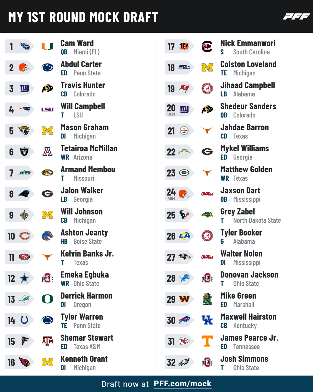 Notes: The assumptions are: 1) the Titans need a QB, 2) Cam Ward is the only QB worthy of a top-3 pick, 3) there's a steep drop off from Abdul Carter and Travis Hunter, and 4) the only teams in play to trade up are the Browns, Giants, and Saints. If the Titans are comfortable with Cam Ward, then this is a wrap. If they aren't comfortable with him, it's likely that either the Browns or Giants are, and if that's true, then the Titans would simply add picks and trade down. Either way, it's likely Cam Ward at 1st overall. ... The Titans weren't linked to the free agent QBs all that much while allowing Mason Rudolph to leave cheaply, and you could read into the Giants being head over heels for Aaron Rodgers as evidence they don't believe a QB will be in play at the top of the draft for them. Typically QBs go 1st overall and typically they go to teams who don't have a QB in place. That's the Titans right now. Let's see if the Browns or Giants make an offer too good to turn down.