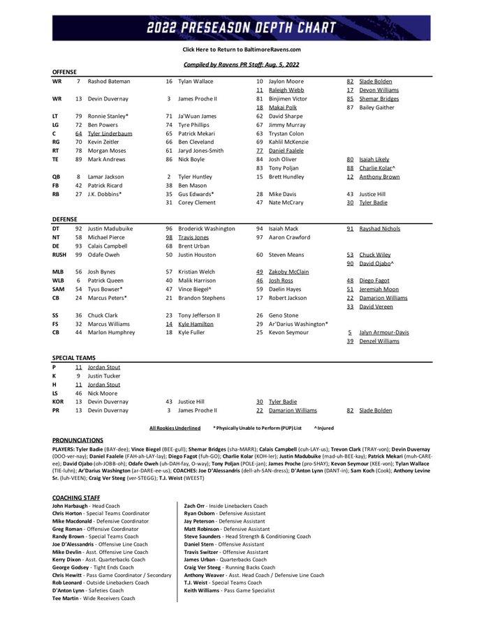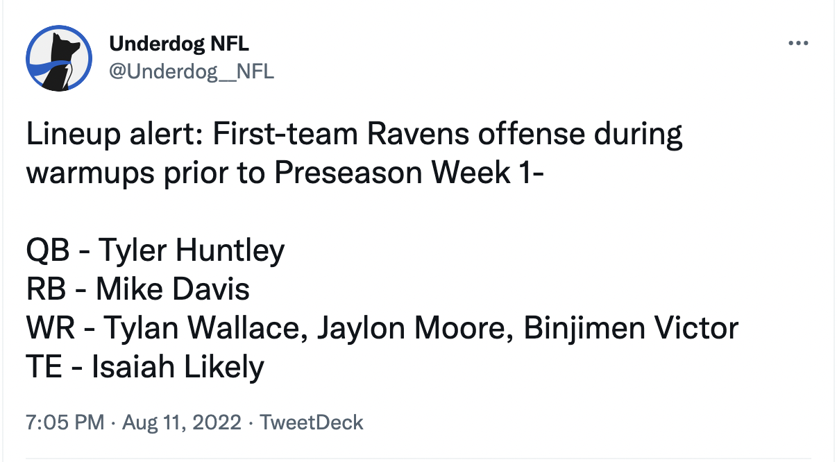 No team has provided us with more preseason information than the Ravens. The list of players that are sidelined is long and includes multiple offensive stars. We don't know who they're planning to start yet, but there's a good shot QB Tyler Huntley, RBs Corey Clement, Mike Davis, and Justice Hill, and TEs Nick Boyle and Isaiah Likely will get some playing time in this game.