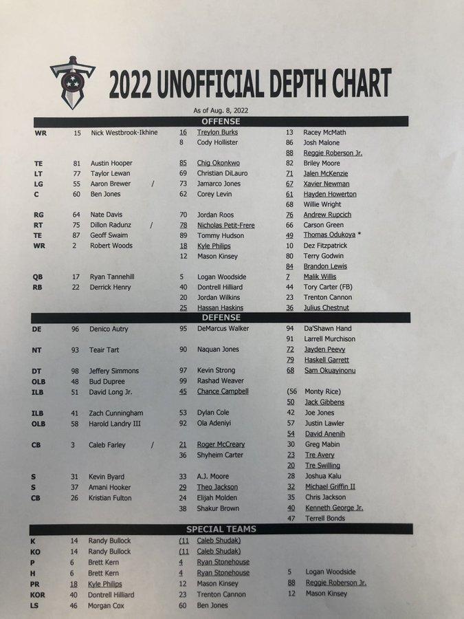 OUT: RB Derrick Henry (rest); UNLIKELY TO PLAY: QB Ryan Tannehill (rest), WR Robert Woods (knee/rest); QUESTIONABLE: RB Dontrell Hilliard (hand), TE Tommy Hudson (leg), TE Briley Moore (undisclosed), CB Caleb Farley (knee)