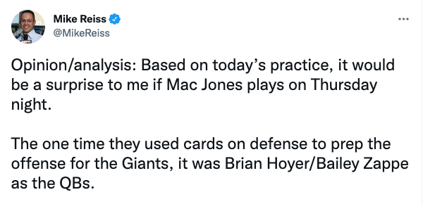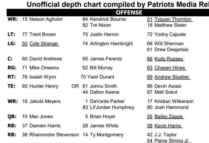 Death. Taxes. Belichick keeping it close to the vest. ESPN NFL Nation Reporter Mike Reiss suspects Jones will likely sit, giving way to backups Brian Hoyer and Bailey Zappe. Hoyer likely won't play much considering his veteran status, leaving much of the playing time to Zappe: