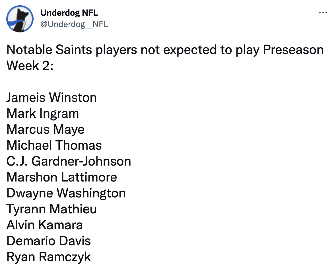 OUT: QB Jameis Winston (foot); UNLIKELY TO PLAY: RB Mark Ingram (rest), RB Alvin Kamara (rest), WR Jarvis Landry (rest), WR Michael Thomas (rest); QUESTIONABLE: RB Dwayne Washington (undisclosed), TE Taysom Hill (ribs), TE Nick Vannett (illness), DE Marcus Davenport (shoulder, finger), LB Pete Werner (groin)