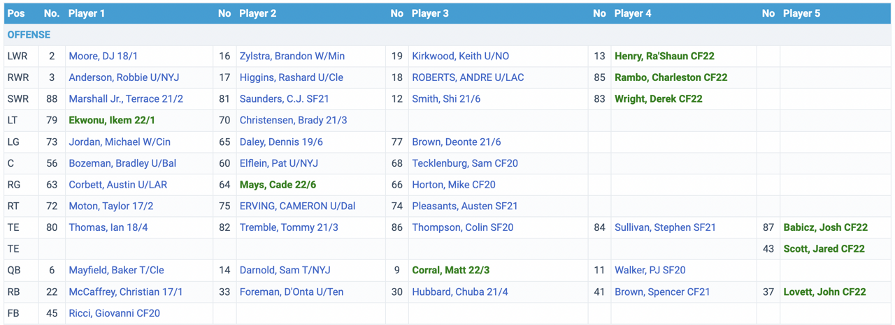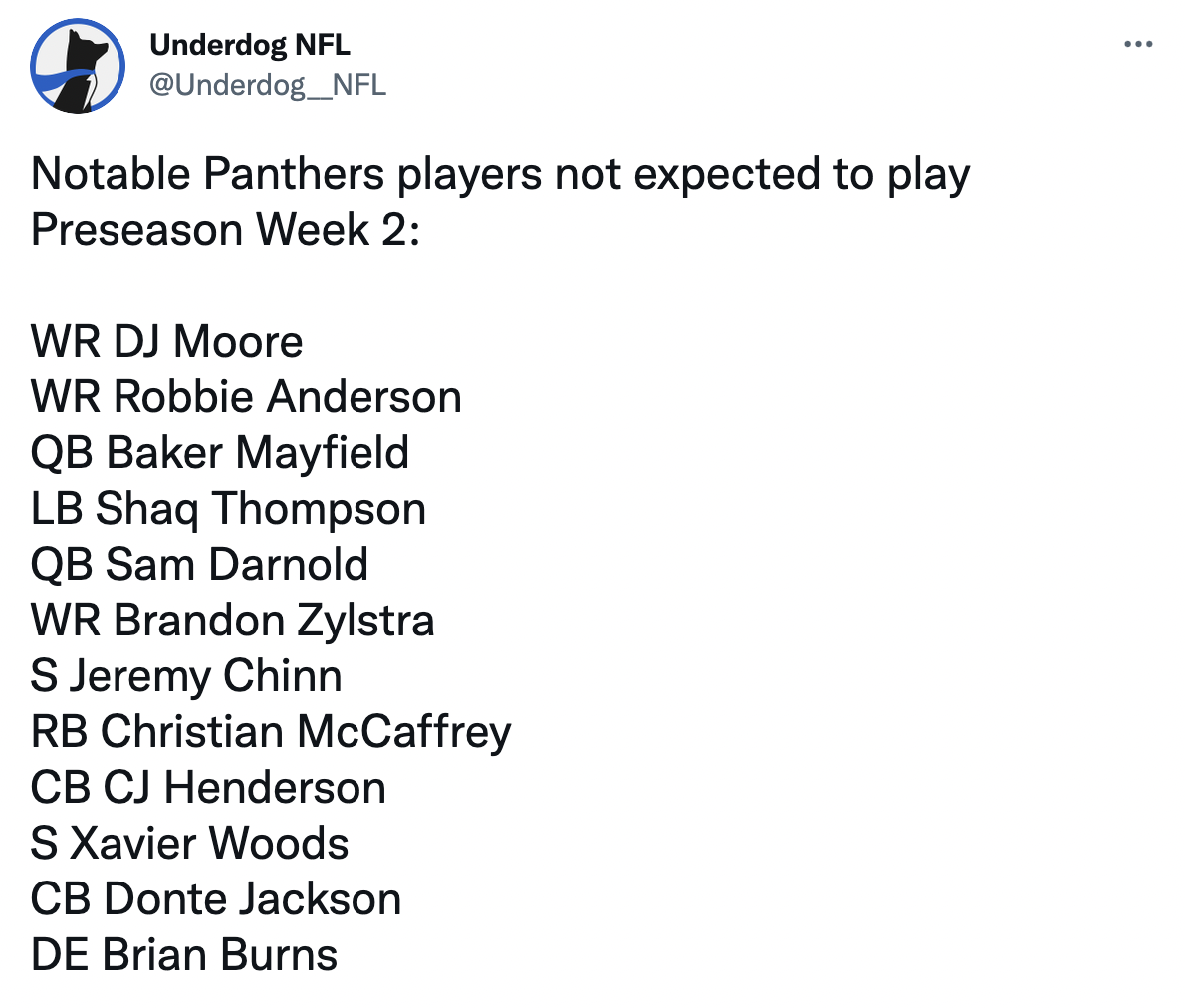 OUT: QB Baker Mayfield (rest), QB Sam Darnold (rest), RB Christian McCaffrey (rest), WR D.J. Moore (rest), WR Terrace Marshall (leg), WR Robbie Anderson (quad), WR C.J. Saunders (quad), WR Andrew Parchment (undisclosed), WR Brandon Zylstra (undisclosed), C Bradley Bozeman (leg), DE Brian Burns (rest), LB Shaq Thompson (knee), S Jeremy Chinn (rest); UNLIKELY TO PLAY: TE Ian Thomas (ribs), TE Josh Babicz (undisclosed); QUESTIONABLE: WR Shi Smith (undisclosed), WR Andre Roberts (undisclosed), TE Collin Thompson (calf), TE Stephen Sullivan (personal), TE Tommy Tremble (undisclosed), CB Jaycee Horn (foot); IN: LT, Ikem Ekwonu