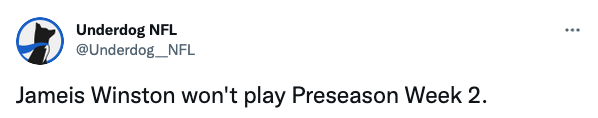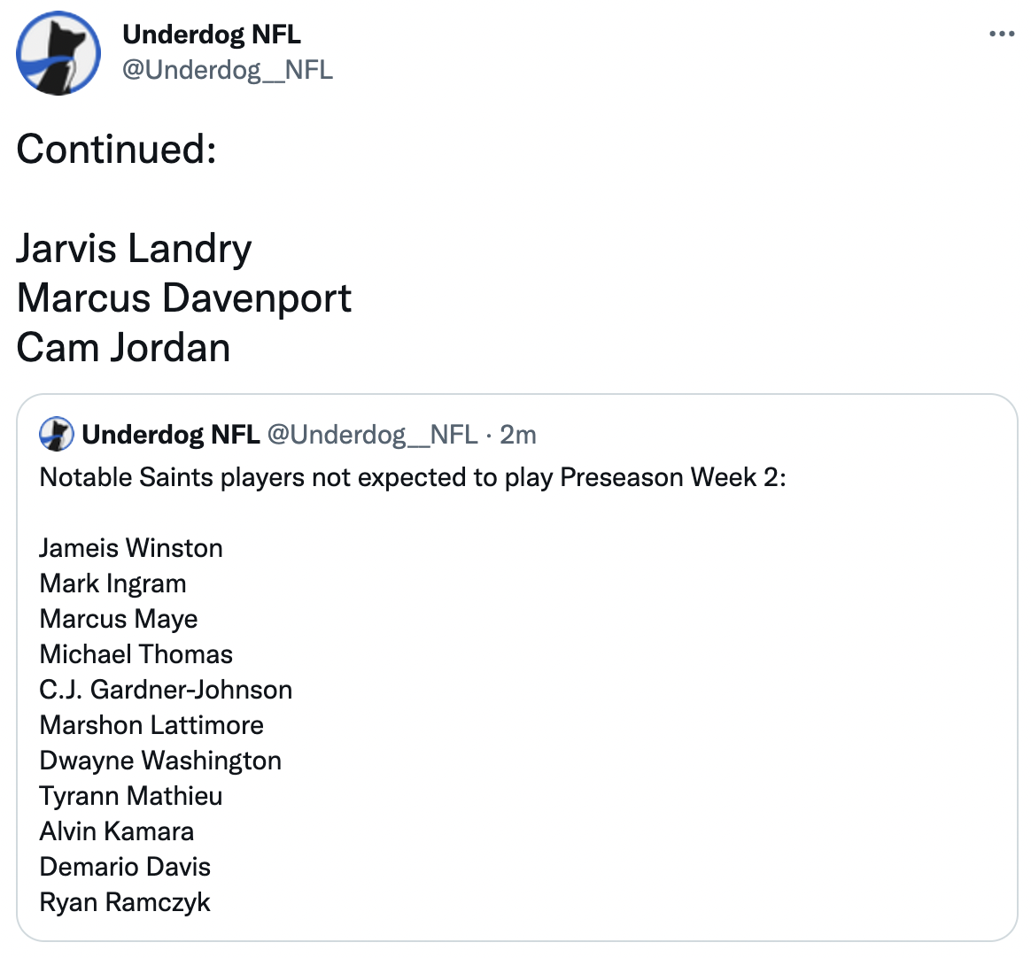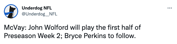 Winston appears to be getting healthier and was seen running sprints on Wednesday, but there is no reason for the team to rush him back in a worthless preseason game. Backup QB Andy Dalton had five passing attempts on six dropbacks and third-string QB Ian Book had 22 attempts on 28 dropbacks in Week 1. According to John DeShazier, Dalton's workload could be expanded to 20 plays, though that is just a guess: