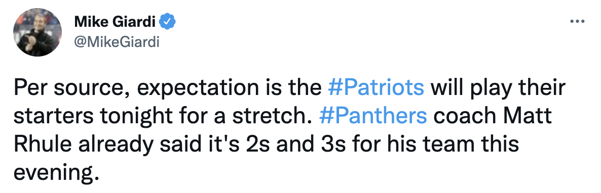 While the Patriots were entering this week with a secretive game plan, Mike Reiss of ESPN and Mike Giardi of NFL Network reported the Patriots are expecting to play "most of" their healthy starters. That includes QB Mac Jones. There wasn't any information on how long they might go, but Giardi did say they'd go "for a stretch", suggesting they may not play very long:
