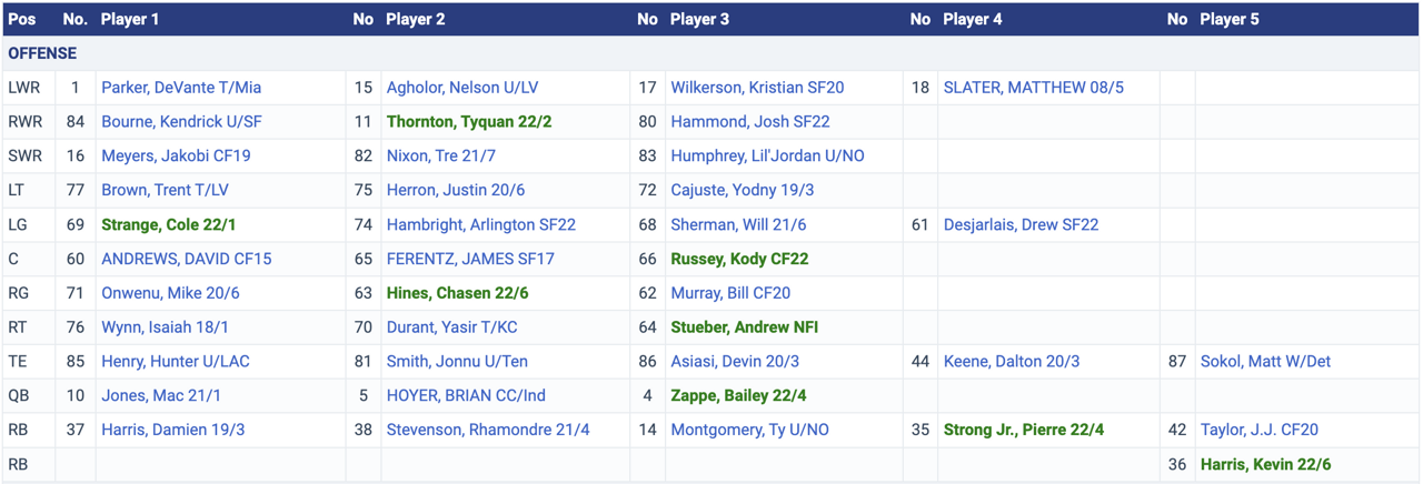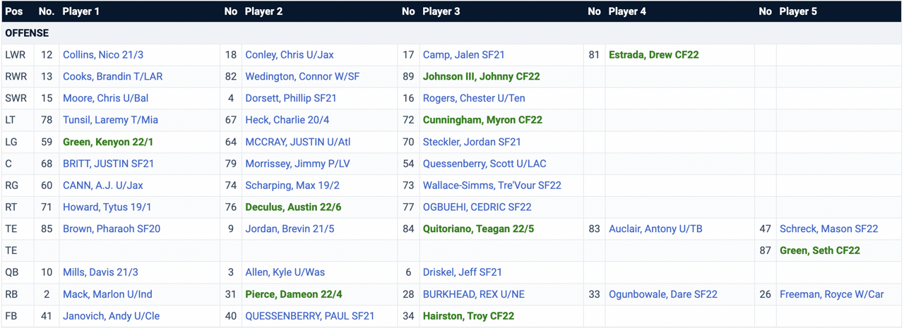 Green Bay has some unknowns at the WR position in terms of availability, while the top two RBs Aaron Jones and A.J. Dillon are going to be rested. WR Amari Rodgers benefitted greatly last game with a position-high 53 snaps. No RB topped Tyler Goodson's 29 snaps. Rookie WR Romeo Doubs (22.6% target share) and WR Juwaan Winfree (9.7% target share) could be in a position for solid workloads once again.