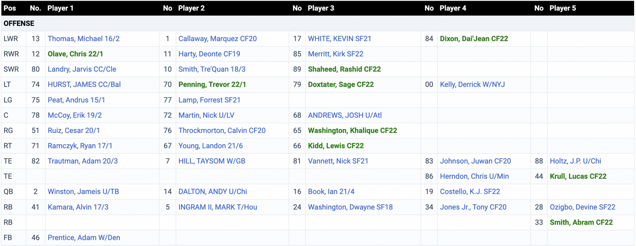 First-round rookie WR Chris Olave played just 15 snaps in Week 1, while WR Kawaan Baker led all skill-position players with 37 snaps. No RB saw more playing time than Devine Ozigbo (21 snaps). It was Dwayne Washington who led the position in rushing attempts (nine) and targets (three), though he could miss Week 2.