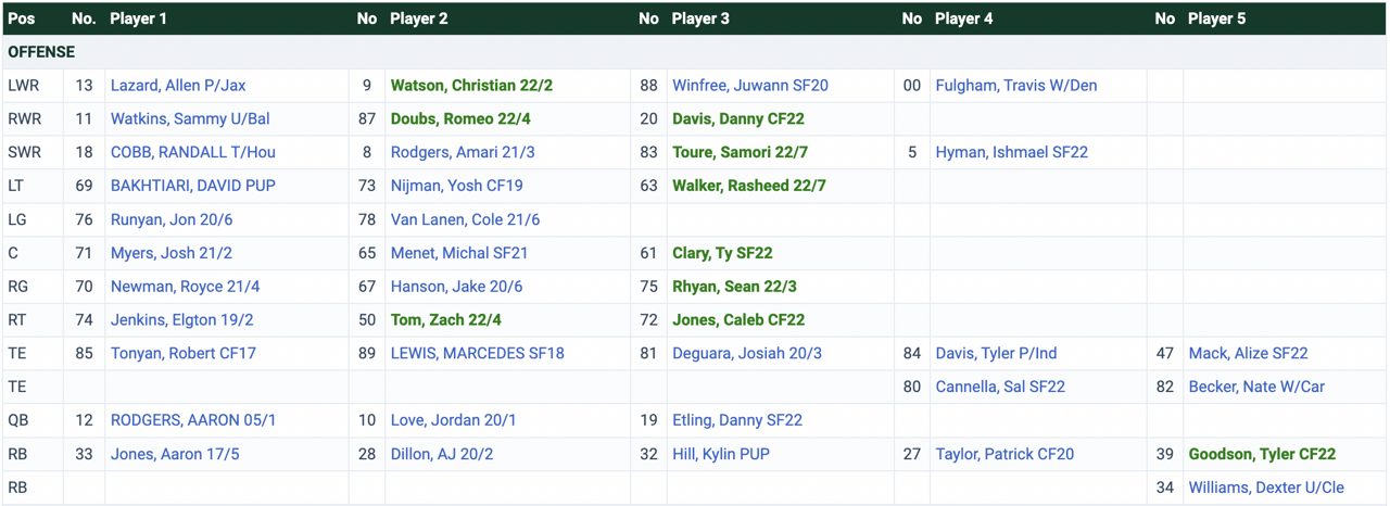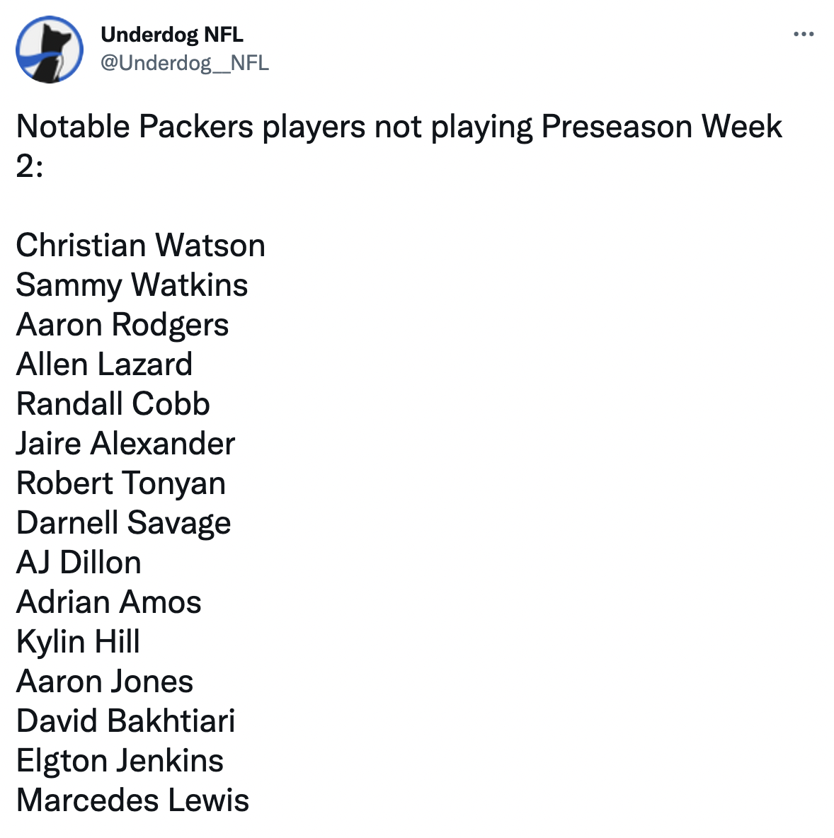 OUT: QB Aaron Rodgers (rest), RB Aaron Jones (rest), RB A.J. Dillon (rest), RB Kylin Hill (knee), WR Sammy Watkins (rest), WR Christian Watson (knee), WR Randall Cobb (rest), WR Allen Lazard (rest), WR Danny Davis (undisclosed), TE Robert Tonyan (knee), TE Marcedes Lewis (rest), LT David Bakhtiari (knee), RT Elgton Jenkins (knee), DE Rashan Gary (rest), S Darnell Savage (hamstring); LIKELY TO PLAY: WR Juwann Winfree (groin)