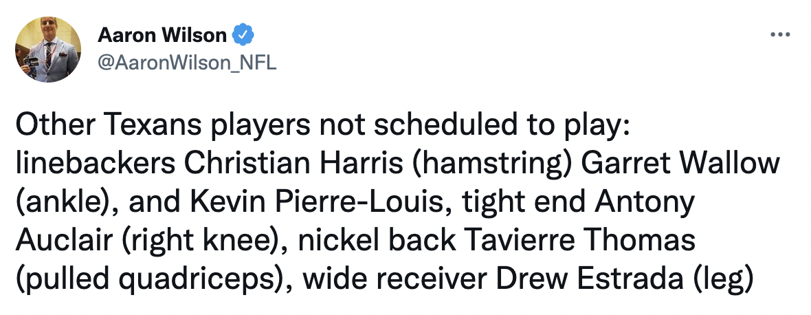 The Texans are going to be missing a handful of players, according to Aaron Wilson of Pro Football Network: