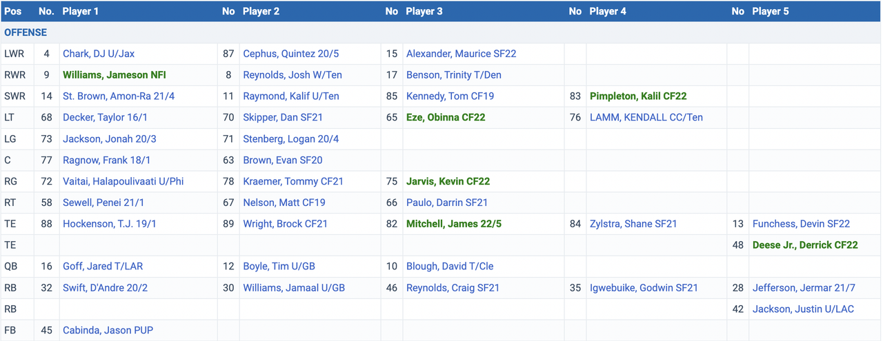 OUT: RB Greg Bell (hamstring), WR Jameson Williams (knee), DE Romeo Okwara (Achilles), DE Josh Pascal (hernia); UNLIKELY TO PLAY: QB Jared Goff (rest), RB Jamaal Williams (rest), RB D'Andre Swift (rest), WR Amon-Ra St. Brown (rest), WR D.J. Chark Jr. (rest), WR Quintez Cephus (leg); QUESTIONABLE: TE Devin Funchess (groin)