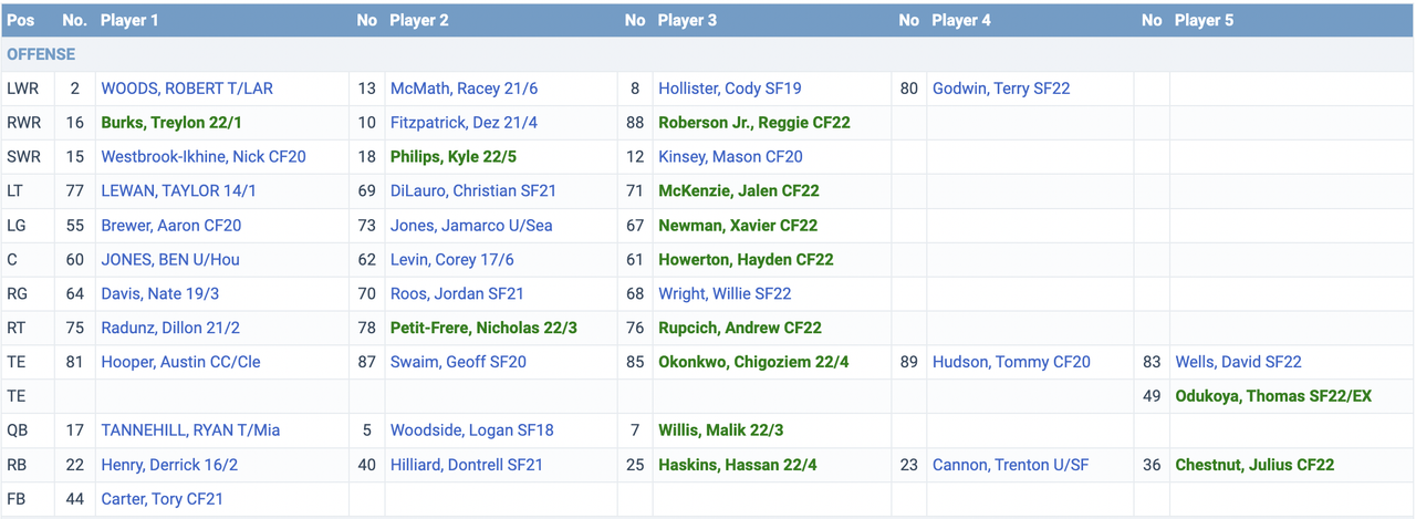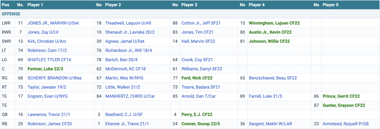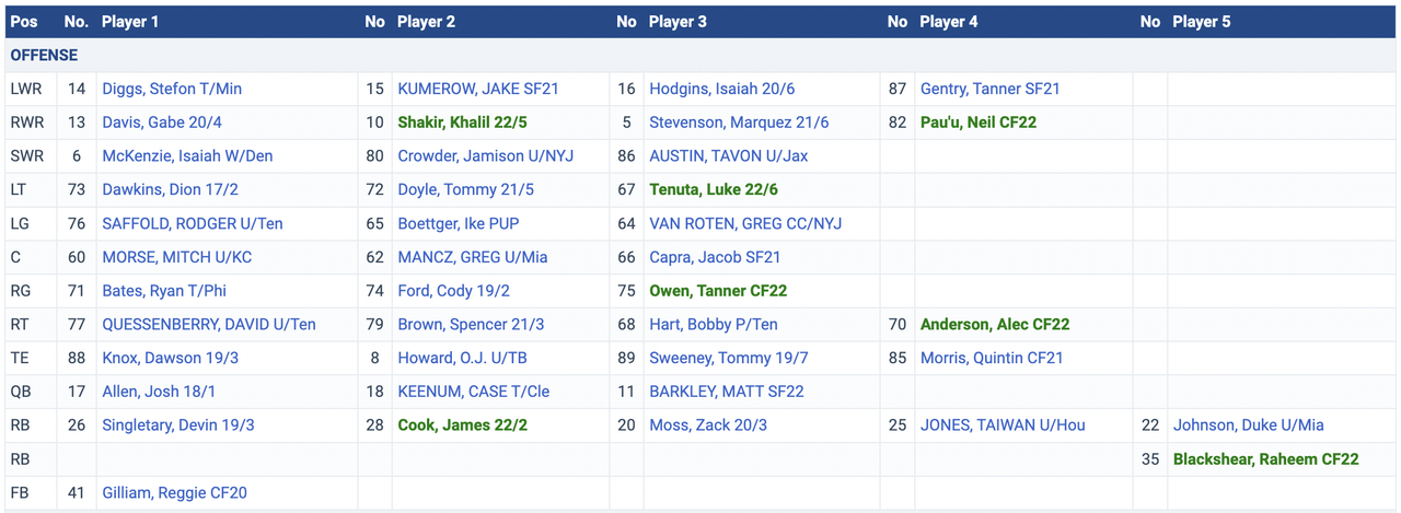 Last week, David Blough led the QB position with 42 snaps, Jermar Jefferson led the RB room with 29 snaps, and Tom Kennedy led the WR group with 43 snaps. We should see a lot of end-of-the-roster players get extended playing time. Kennedy is one to circle as he demanded a team-high 24.44% target share last week.