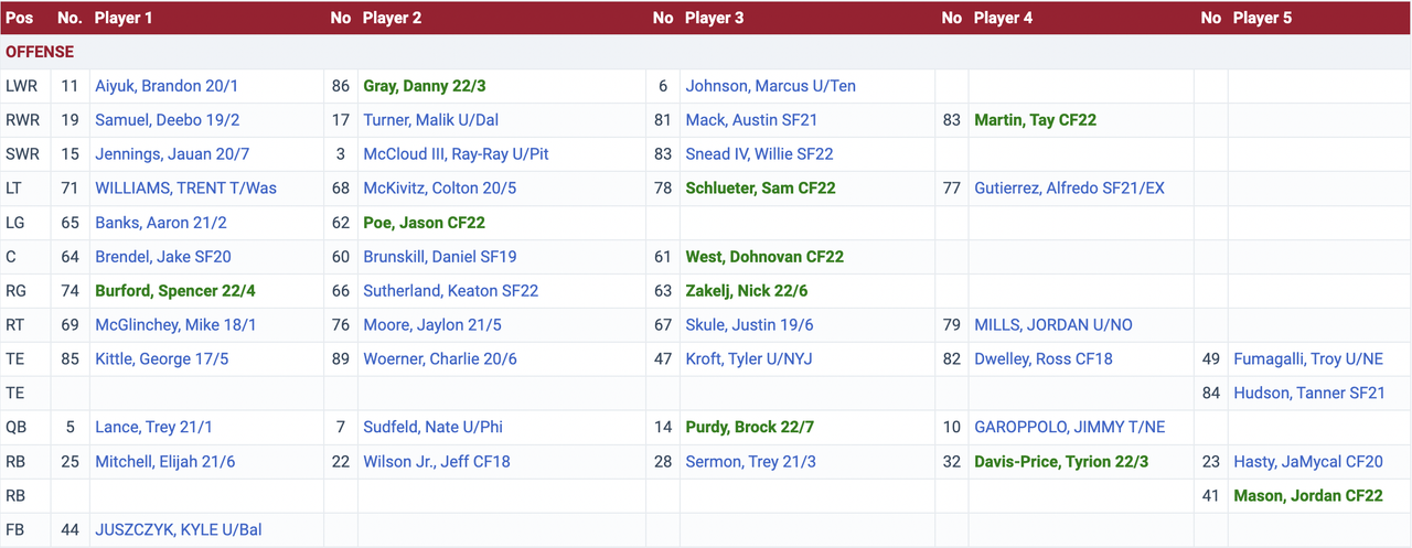RB Elijah Mitchell (hamstring) may as well be considered a lock to sit this game out, too. There should be plenty of playing time available for Tyrion Davis-Price, JaMycal Hasty, and Jordan Mason. Trey Sermon appears to be "dinged", too. He could sit this game out as a precaution.