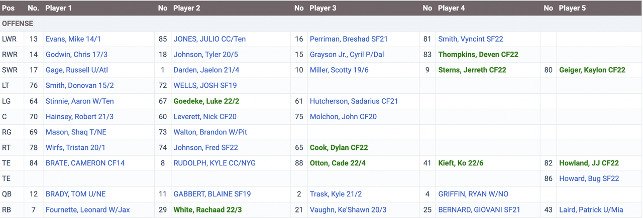 WR is a position to circle with so many names listed on the injury report. Jaelon Darden (27 snaps), Scotty Miller (26 snaps), and Deven Thompkins (25 snaps) all got significant playing time in Week 1 with the same veterans sidelined.