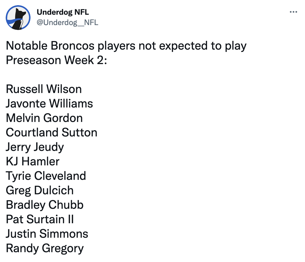 OUT: RB Damarea Crockett (knee), WR Tim Patrick (knee); UNLIKELY TO PLAY: QB Russell Wilson (rest), RB Javonte Williams (rest), RB Melvin Gordon (foot), WR K.J. Hamler (knee), WR Courtland Sutton (rest), WR Jerry Jeudy (rest), WR Tyrie Cleveland (throat), TE Greg Dulcich (hamstring), RT Billy Turner (knee), CB Ronald Darby (chest), DE Randy Gregory (shoulder); QUESTIONABLE: C Lloyd Cushenberry (leg), CB K'Waun Williams (knee)