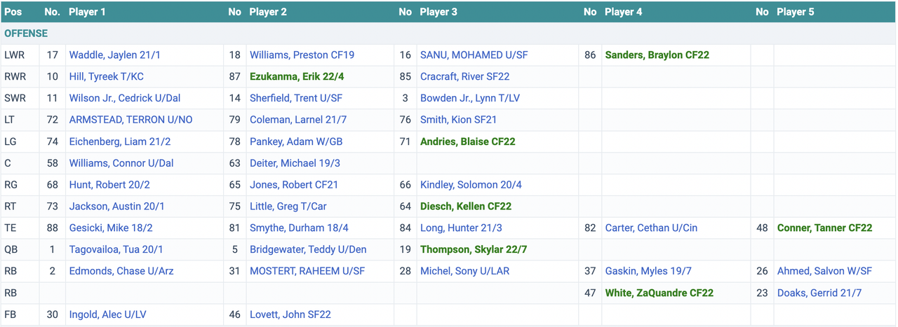 OUT: WR Jaylen Waddle (rest), TE Adam Shaheen (knee); EXPECTED TO PLAY: QB Tua Tagovailoa (rest), RB Chase Edmonds (rest), RB Raheem Mostert (knee), WR Tyreek Hill (rest)