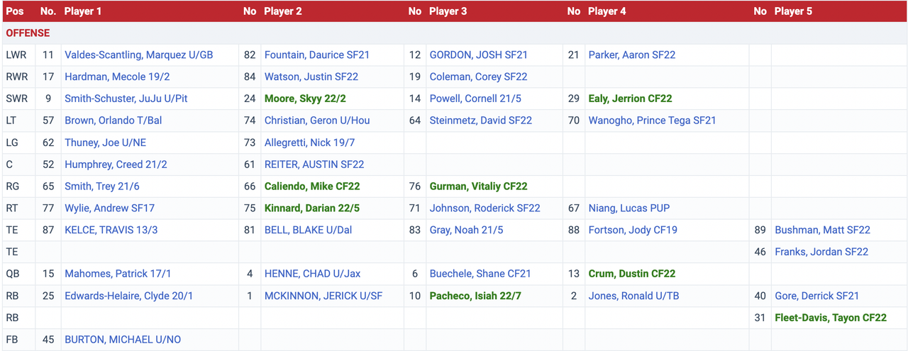 OUT: QB Chad Henne (undisclosed), WR JuJu Smith-Schuster (knee), WR Mecole Hardman (groin), WR Justyn Ross (foot), TE Blake Bell (hip), RT Lucas Niang (knee); QUESTIONABLE: RB Jerick McKinnon (hamstring), DE Frank Clark (illness), DT Chris Jones (back), CB Rashad Fenton (shoulder); LIKELY TO PLAY: TE Jody Fortson (quad)