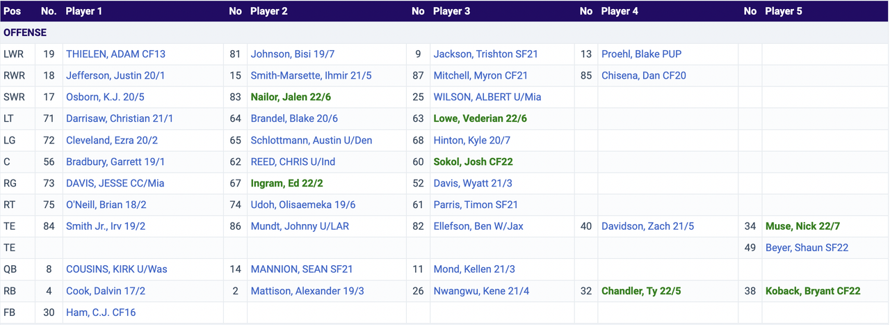 OUT: QB Kirk Cousins (rest), RB Dalvin Cook (rest), WR Justin Jefferson (rest), WR Adam Thielen (rest), WR Blake Proehl (knee), TE Irv Smith Jr (thumb); UNLIKELY TO PLAY: WR Dan Chisena (leg); QUESTIONABLE: RB Ty Chandler (ankle)
