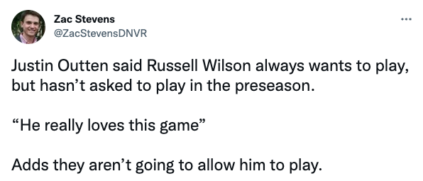 "As such, most Broncos starters will not play at Buffalo on Saturday at 11 a.m. or in the home finale a week later against Minnesota. The Packers, the last stop on Hackett’s coaching journey, employed a similar plan last summer and went 13-4. Hackett looks to protect the players, to keep them fresh, while maximizing mental reps."