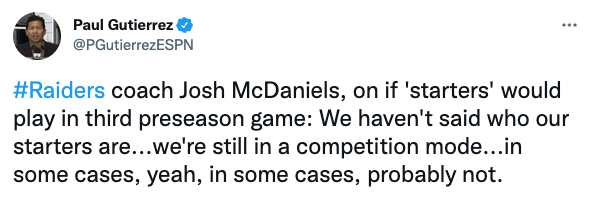 "The healthy Raiders are continuing to prepare for their preseason home opener against the Vikings at 1:25 p.m. PT on Sunday. It’s doubtful that players such as Derek Carr, Davante Adams and Maxx Crosby will play, but McDaniels clearly doesn’t have a hard-and-fast rule when it comes to playing starters in the preseason given that several projected starters suited up against the Jaguars last week.