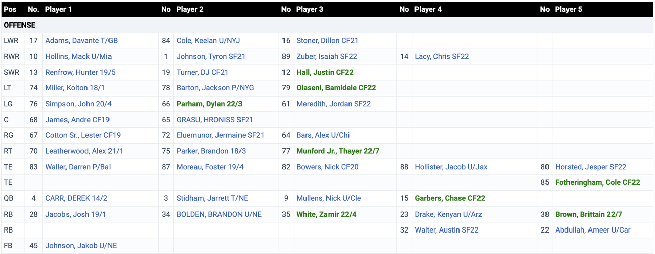 UNLIKELY TO PLAY: QB Derek Carr (rest), WR Davante Adams (rest), DE Maxx Crosby (rest), TE Jacob Hollister (undisclosed), CB Trayvon Mullen (foot); QUESTIONABLE: RB Josh Jacobs (undisclosed), TE Darren Waller (hamstring), TE Jesper Horsted (undisclosed); LIKELY TO PLAY: WR Dillon Stoner (undisclosed)