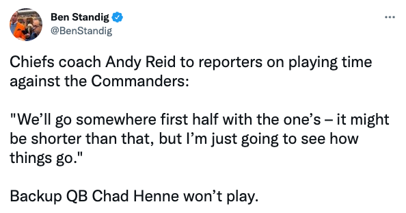 Backup QB Chad Henne won't play. The Chiefs will pivot to Shane Buechele and Dustin Crum after Patrick Mahomes.