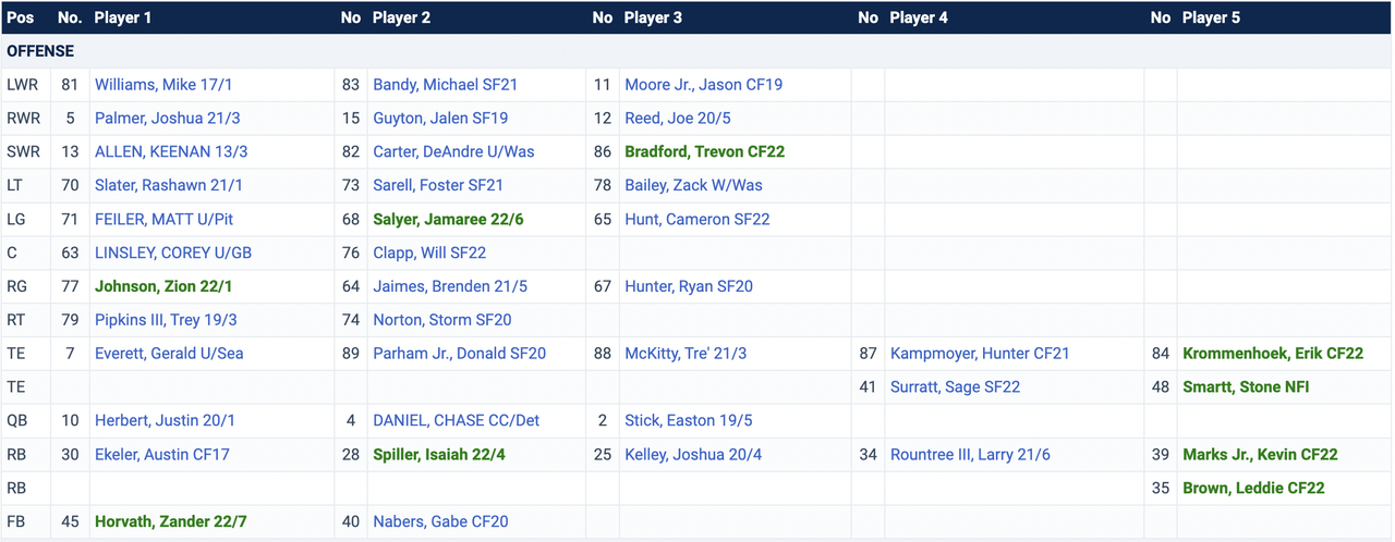 We do know all three of Joshua Kelley, Isaiah Spiller, and Larry Rountree will play. All three are in a battle for the backup RB job, though Kelley appears to be in the lead for those duties.