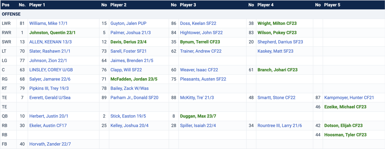 OUT: WR Jalen Guyton (undisclosed); QUESTIONABLE: RB Tyler Hoosman (undisclosed); WR Josh Palmer (undisclosed); WR Darrius Shepherd (undisclosed); WR John Hightower (undisclosed); CB J.C. Jackson (knee)
