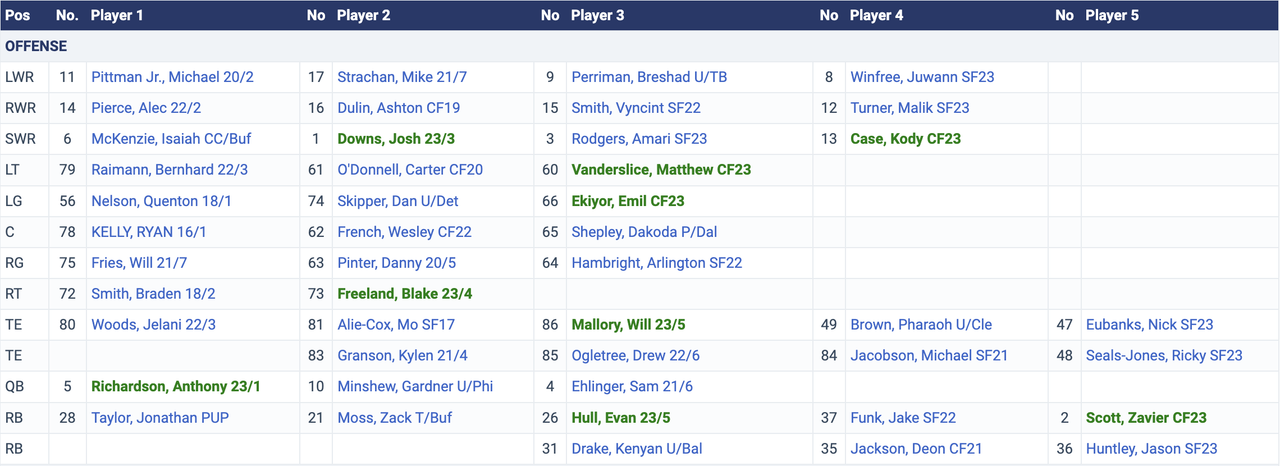 OUT: RB Jonathan Taylor (ankle); RB Zack Moss (arm); WR Ethan Fernea (undisclosed); TE Will Mallory (foot); QUESTIONABLE: RB Deon Jackson (undisclosed); WR Zavier Scott (undisclosed); TE Andrew Ogletree (knee); TE Jelani Woods (hamstring); TE Mo Alie-Cox (ankle); DT DeForest Buckner (foot); LB Shaq Leonard (back)