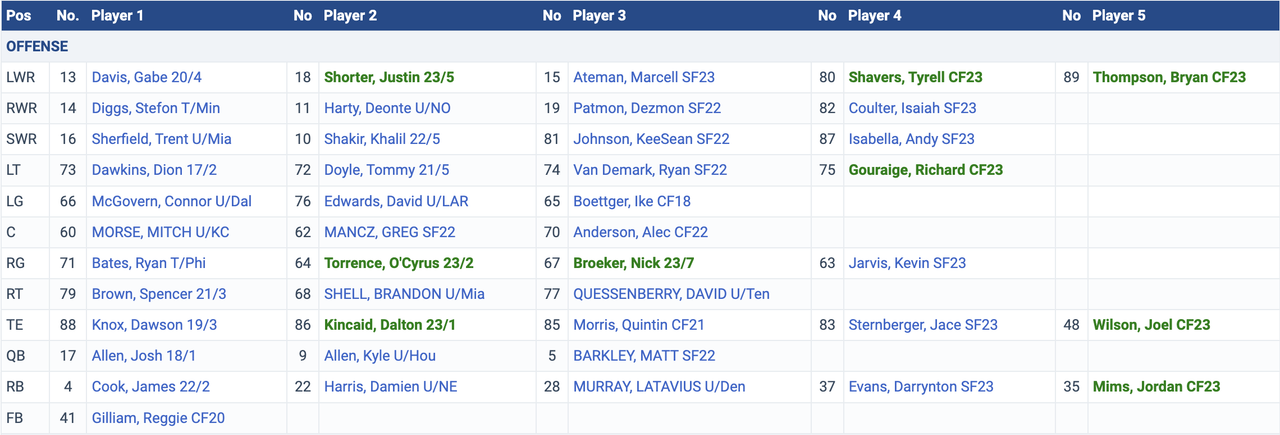 OUT: QB Josh Allen (rest); RB Nyheim Hines (knee); WR Stefon Diggs (rest); EDGE Von Miller (knee); QUESTIONABLE: RB Damien Harris (knee); FB Reggie Gilliam (groin); WR Bryan Thompson (concussion); WR Isaiah Coulter (knee)