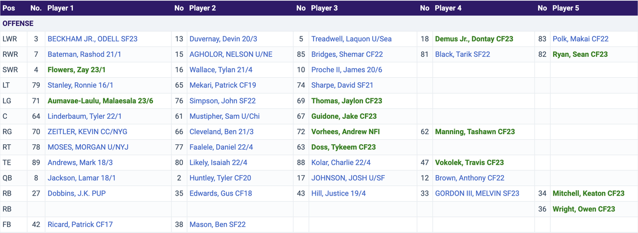 OUT: QB Lamar Jackson (rest); RB J.K. Dobbins (undisclosed); WR Odell Beckham Jr. (rest); WR Makai Polk (undisclosed); WR Rashod Bateman (foot); TE Mark Andrews (rest)