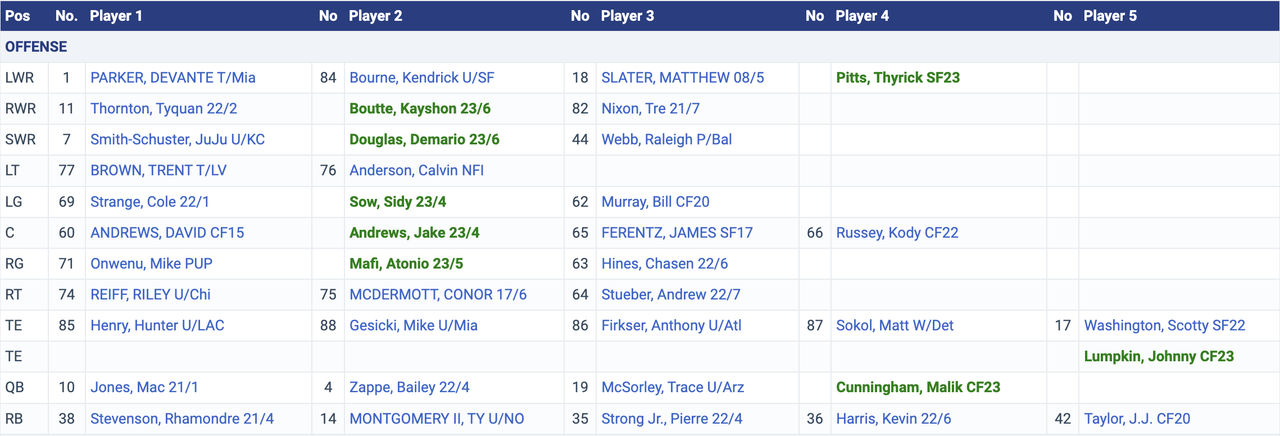 According to Mike Kadlick of WEEI, he guesses the Patriots are likely to sit QB Mac Jones, WR's JuJu Smith-Schuster, DeVante Parker, and Kendrick Bourne, and TE's Hunter Henry and TE Mike Gesicki. Kadlick also mentioned the Patriots were running a "first team" offense on Tuesday that included QB Bailey Zappe, WR's Tyquan Thornton, Kayshon Boutte, and Demario Douglas, and TE Anthony Firkser.