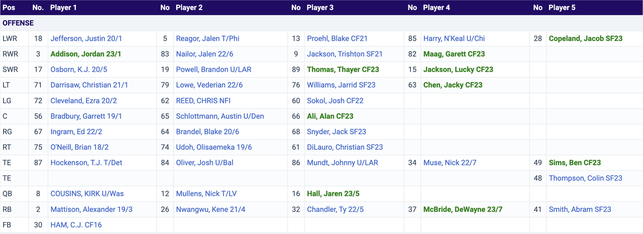 And while O’Connell said Monday that [Jordan] Addison will likely play some snaps Thursday night, I would not expect him to carry a heavy load. He matters too much to this offense to put him in harm’s way. And yes, he has lived up to his first-round billing.