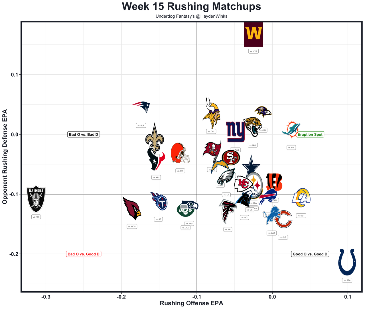 It's an eruption spot at the Giants against the worst rushing EPA defense, but the baseline is the baseline. C-Rod is the RB41 on RB36 usage this month as the lead back. He'll lose some touches to Bill and then the pass-game work to Jeremy McNichols before whatever happens at QB and with Deebo Samuel. Rodriguez needs the Commanders to play better in general to have a chance for a red zone score. They have a 22.0-point team total.