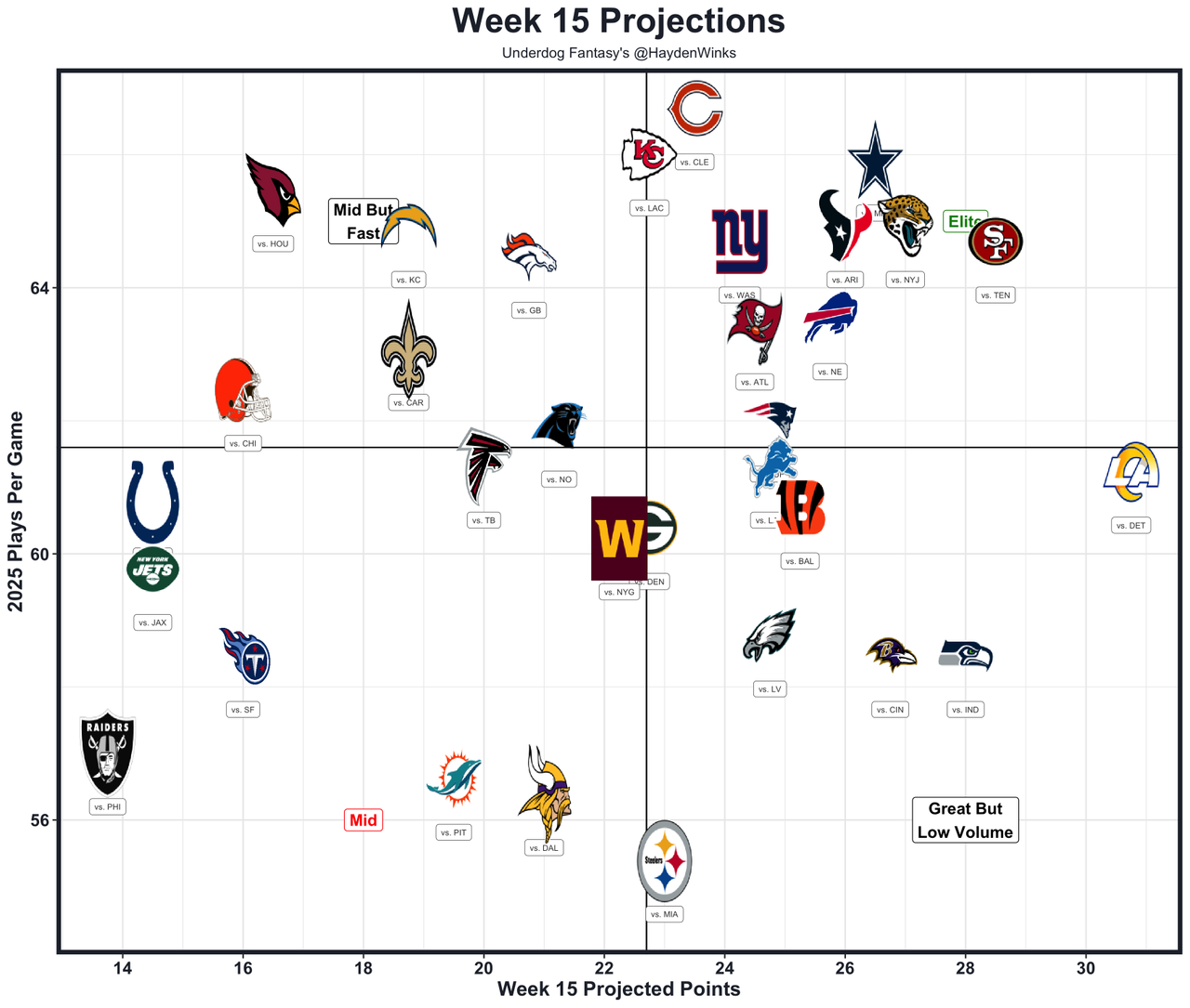 He's had 11.1 and 12.8 expected half PPR points in the last two games (RB24 usage), even with Isaiah Pacheco back in the mix stealing some early-down work. Hunt is simply one of the best RBs in the game with 0-3 yards to go, and the Chiefs hand it to him plenty at the goal line. Kansas City's OL is missing key pieces, thus their team total sits at a league-average 22.75 points.