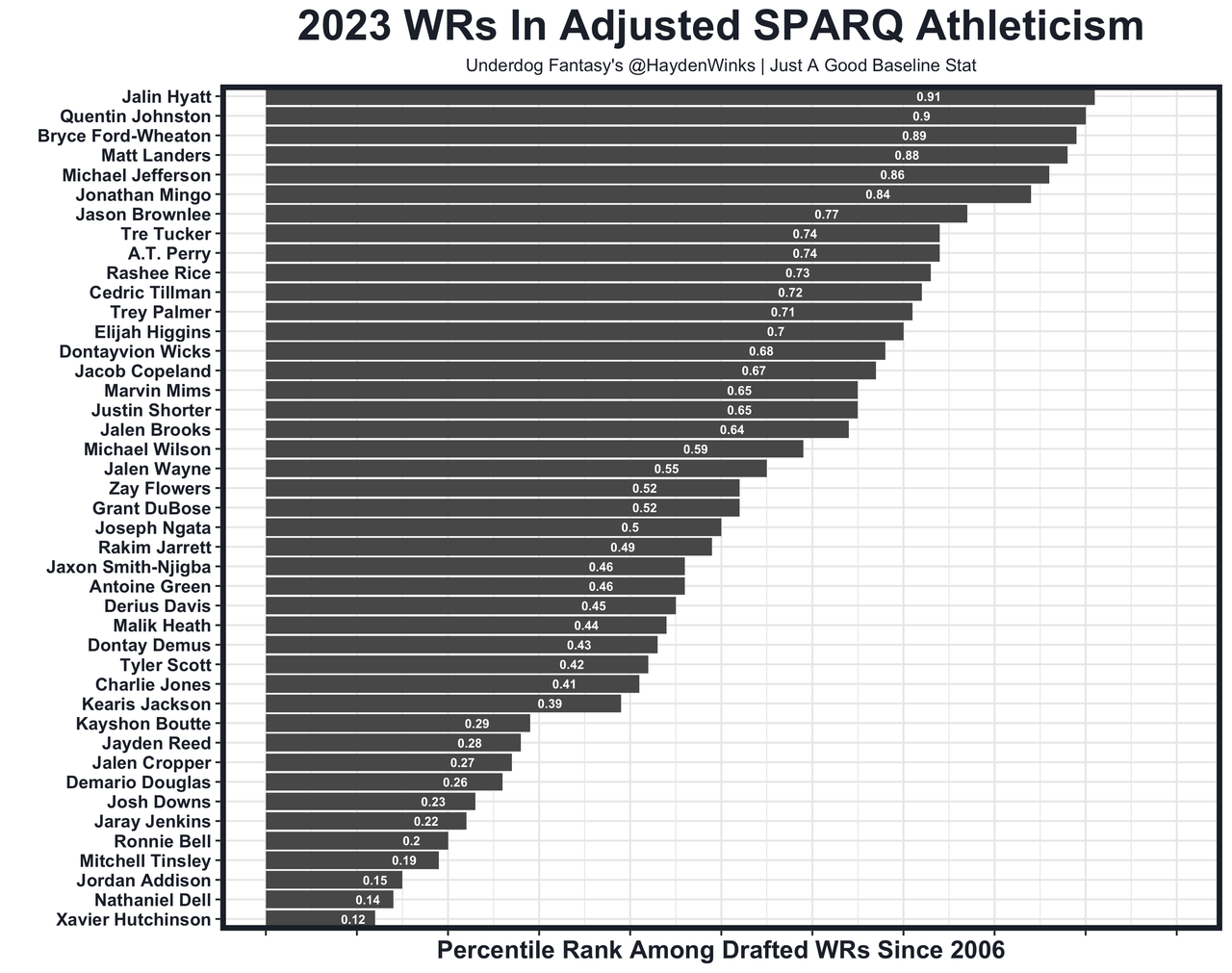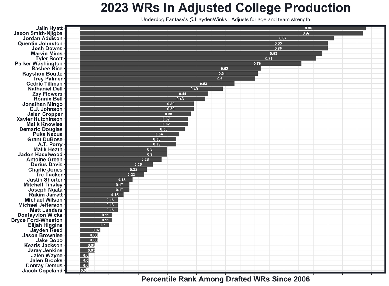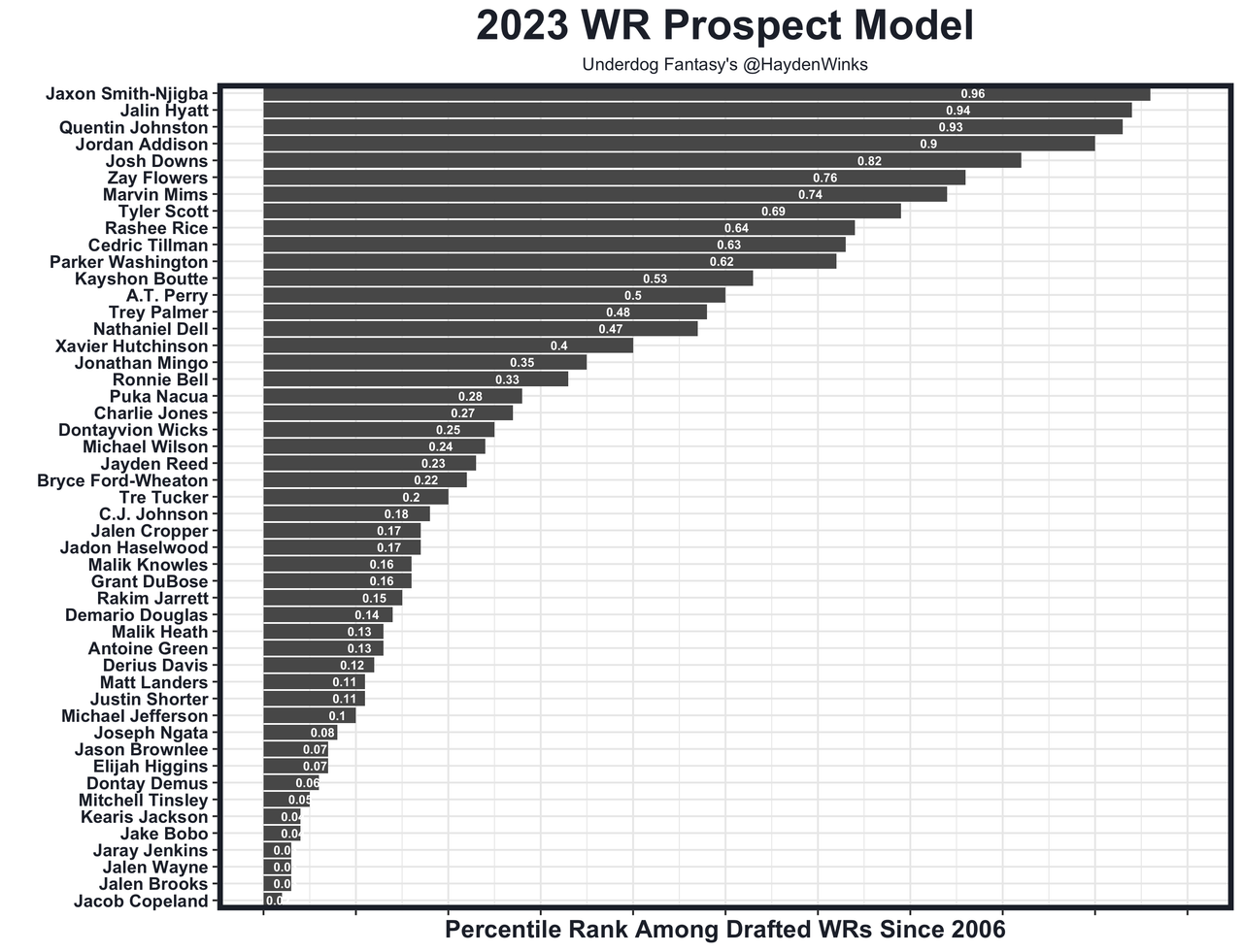 2023 NFL Draft wide receiver rankings, grades, profiles, analytics, and film notes for the consensus top-6 WR prospects -- Jordan Addison, Jaxon Smith-Njigba, Jalin Hyatt, Quentin Johnston, Josh Downs, and Zay Flowers. Hayden Winks drops his early looks at each prospect, with more notes coming as we get closer to the 2023 NFL Draft.
