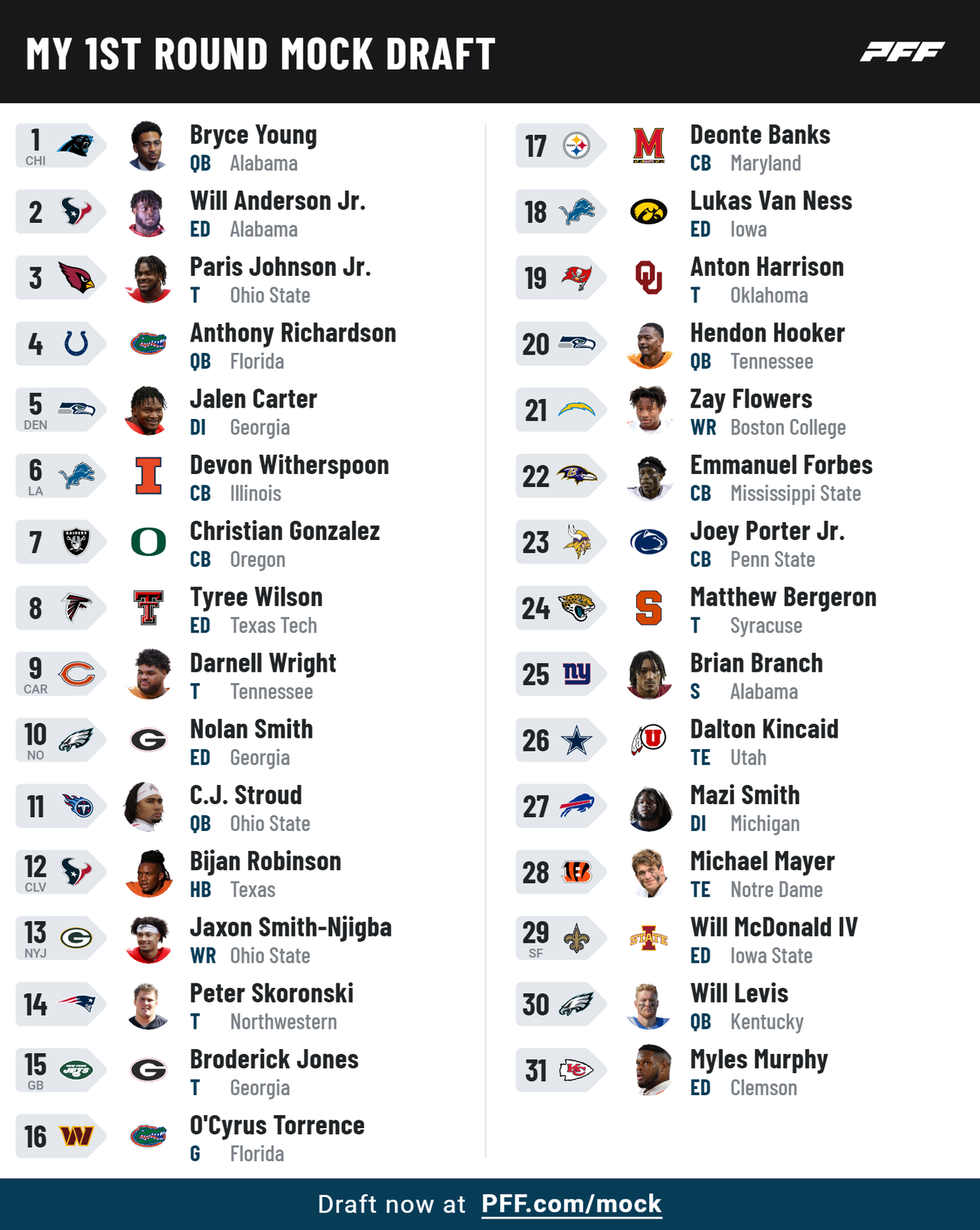 Torrence might be more of a trade back player for Washington, but I have heard they are fans. Torrence did start at LG as a freshman at Florida, and then at RG for the last three seasons, so he fits the Commanders’ reshuffling. Darnell Wright and Deonte Banks were two other considerations.
