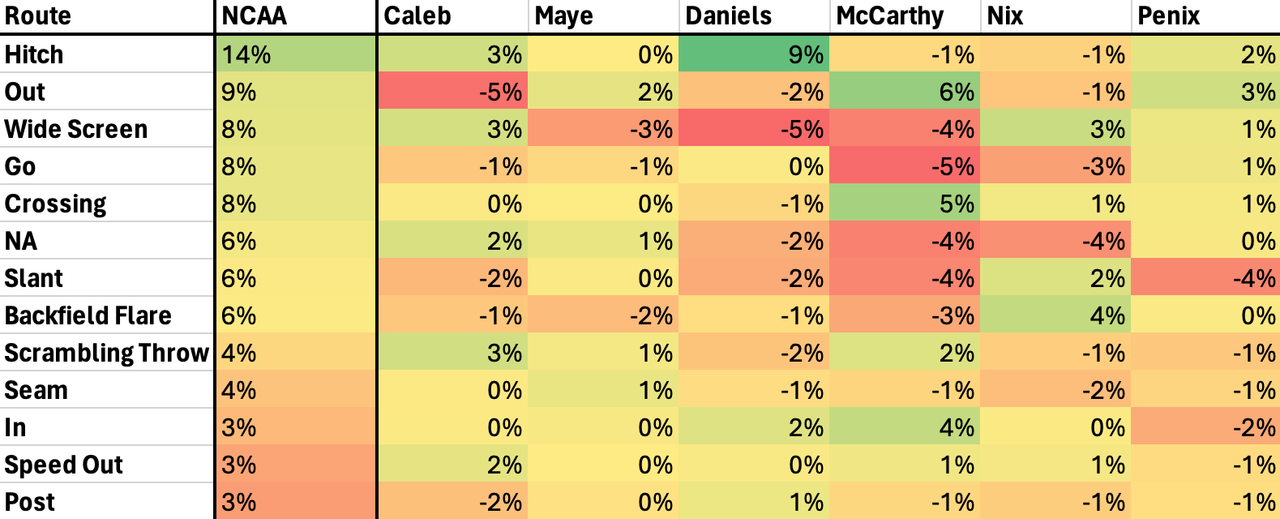 This chart shows how often each QB threw the most common routes relative to the average college QB. For example, the average QB threw the hitch route on 14% of attempts, while Caleb Williams threw them 17% of the time (+3% in the table). Data from PFF.