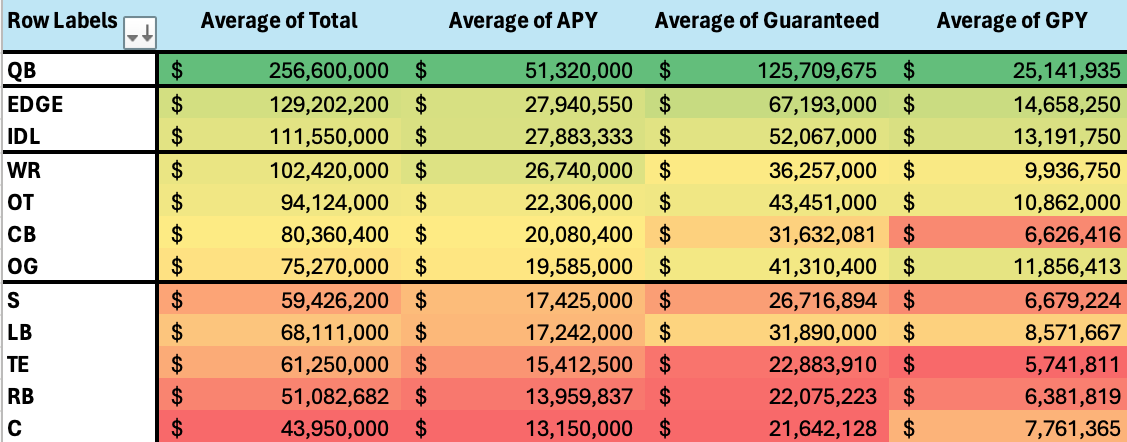 Specifically for QB grades, the potential value gained by hitting on a QB means there will be a lot of Round 1 grades, even for flawed prospects. Just look at the table below to see how much the top 5 QBs are paid in free agency compared to literally every other position's top 5 players. It'd be easier to just fade every QB by handing out Round 2/3 grades because most QB prospects bust, but the upside of hitting on one is worth some misses. Remember, highly-rated EDGEs, OTs, WRs, and CBs bust all the time. If you pass on that imperfect QB, your team is still at risk of drafting a bust at a position that doesn't hold the upside of the QB. Don't be scared to whiff.