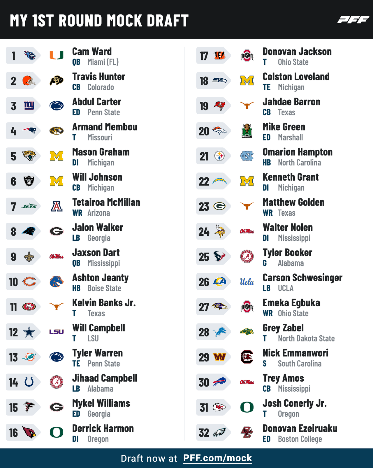Just missed: QB Shedeur Sanders, QB Jalen Milroe, QB Tyler Shough, RB TreVeyon Henderson, WR Luther Burden, WR Jaylin Noel, WR Jayden Higgins, TE Mason Taylor, OT Josh Simmons, OT Aireontae Ersery, OG Grey Zabel, EDGE James Pearce Jr., CB Maxwell Hairston, CB Shavon Revel, S Malaki Starks.