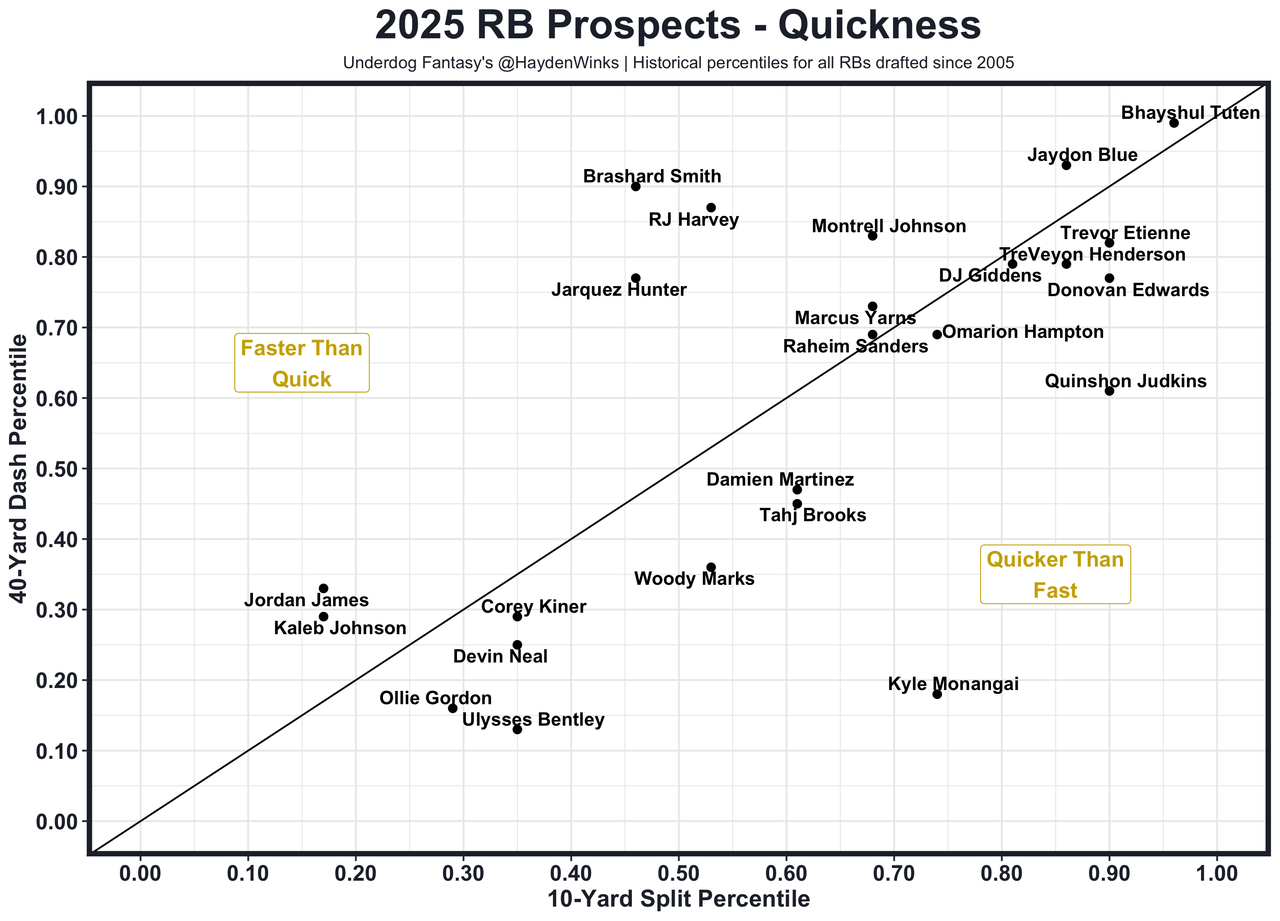 The 22-year-old is a classic one-cut runner and a perfect fit for wide-zone schemes, where he posted an elite 7.6 YPC on outside zone runs in college. Tuten is an electric speedster with a 4.32 forty, 96th percentile 10-yard split, and 93rd percentile jumps, though his 16th percentile short shuttle confirms he’s not shifty in tight spaces. On tape, he's just that. The straight-line speed is game-altering if he can get to the perimeter or find a cutback lane. He attempts to run hard up the middle, but he left him self open to fumbles and never exceeded 206 touches in a season. That left his adjusted college production in the 59th percentile among drafted RBs. He also never had an under-center carry in two years at Virginia Tech. Zero. For a smaller back (5'9"/206), Tuten is an underwhelming receiver with drop problems and was never showcased with schemed touches there (33rd percentile career receiving yards). For now, he's an early-down change-of-pace burner. The Shanahan tree has to have interest, even if it leads to 5-12 touches per game only.