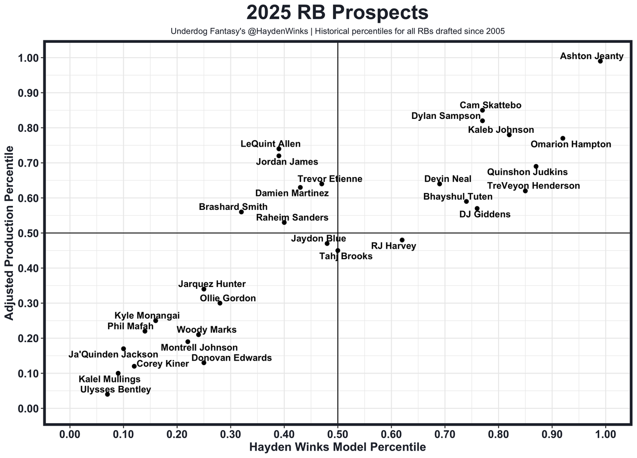 The 22-year-old early declare averaged 169 total YPG and ranks in the 77th percentile of PPR points per game among drafted RBs since 2005. At 6'0"/221 with tree trunk quads, his contact balance is an obvious strength, forcing a missed tackle every 3.8 carries. Jeanty was at 2.5 for reference. Hampton has good burst through gaps (93rd percentile broad jump) and long speed (4.46 forty) for his size, making him a threat to break long runs. Most of his experience is in a zone-based, RPO and shotgun-heavy offense with just 31 under-center carries over the last two years. His vision can be a little excited, but when he finds the hole, he is a total problem for defenses. As a receiver, he caught 29 and 38 passes in his last two seasons, primarily on swing passes, shovels, and screens, but Hampton occasionally ran option and angle routes, too. His open-field explosiveness and slalom-like agility make him dangerous with the ball in space. He has clear 3-down ability.